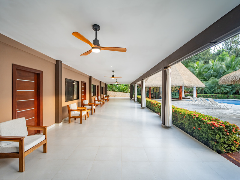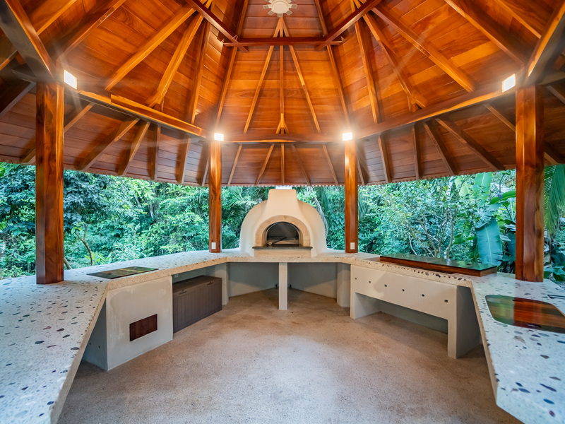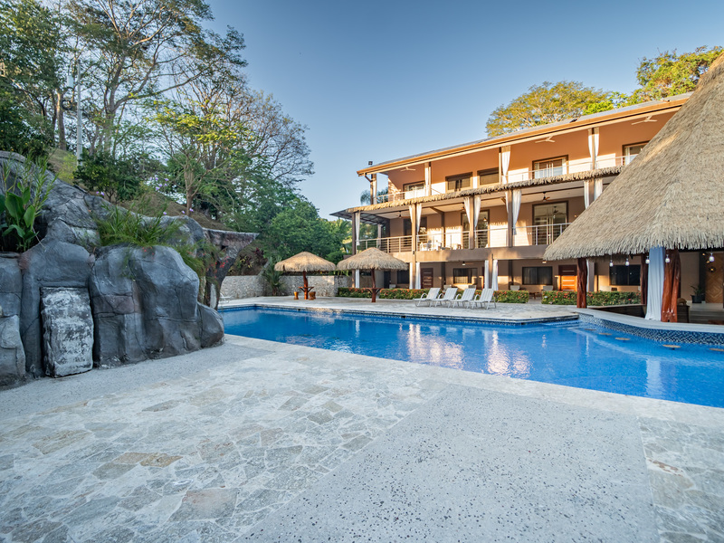 A large swimming pool with a waterfall feature anchors the estate, surrounded by generous communal spaces including a poolside bar, outdoor kitchen and BBQ area, and both covered and open-air lounge zones. The grounds are fully landscaped with lush tropical gardens and tons of mature fruit trees, creating a private and serene environment throughout the property.