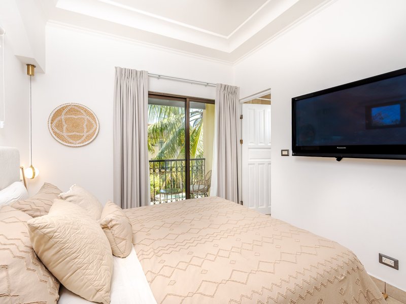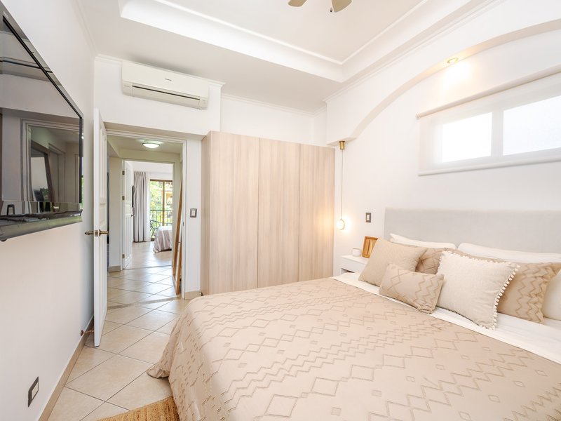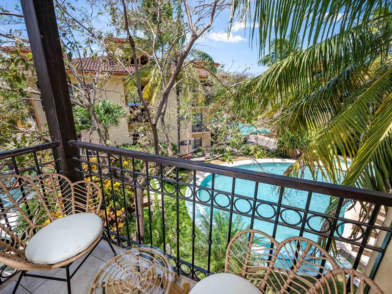 Enjoy two private balconies, one with serene views of the lush pool area, perfect for relaxation. The apartment also includes air conditioning for optimal comfort and a dedicated laundry area with a modern washer and dryer for convenience.