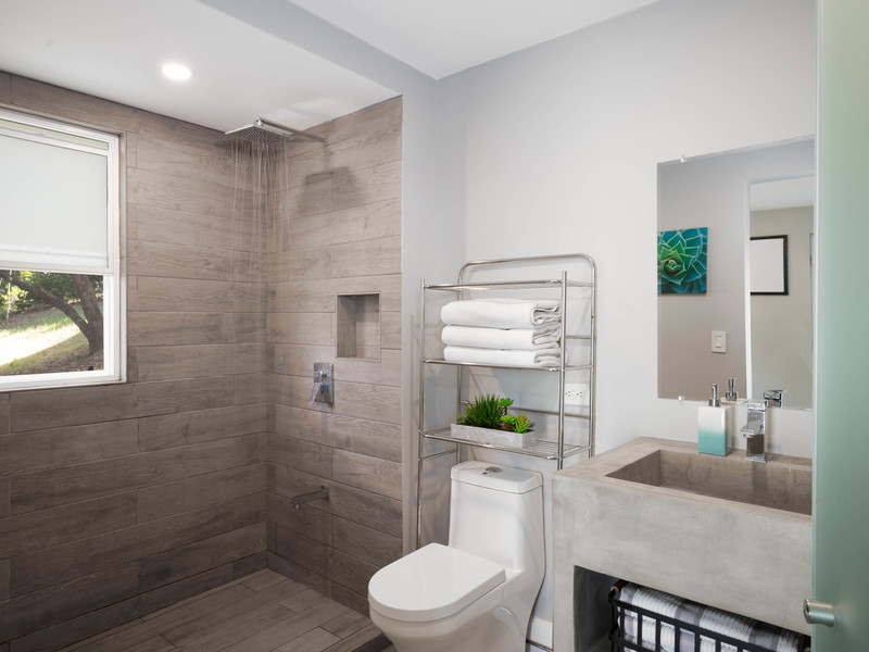 The Tree House has an open living, kitchen and dining space that connects onto the home's terrace, overlooking the valley. The setup separates the master suite - and its private balcony - from the main space.