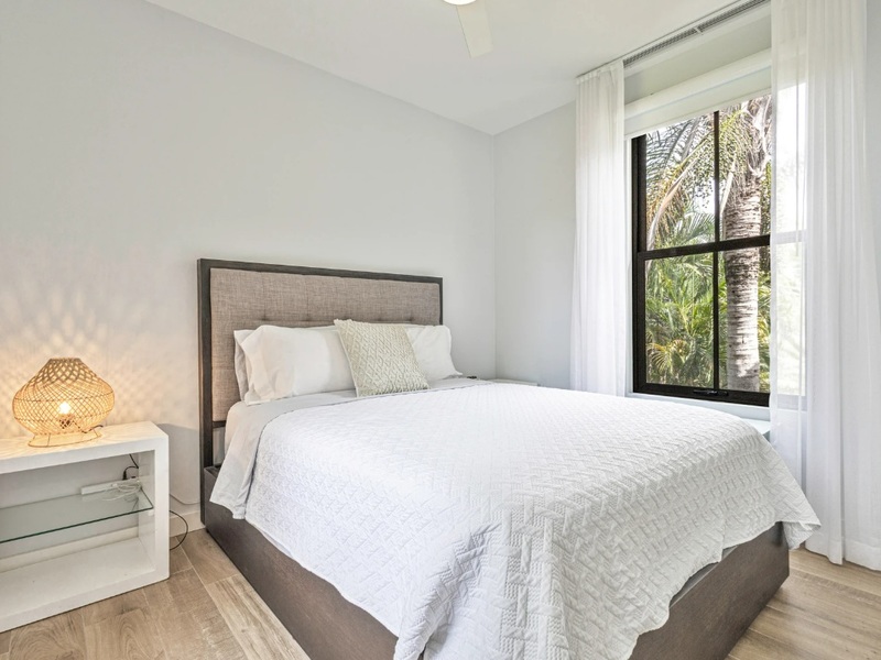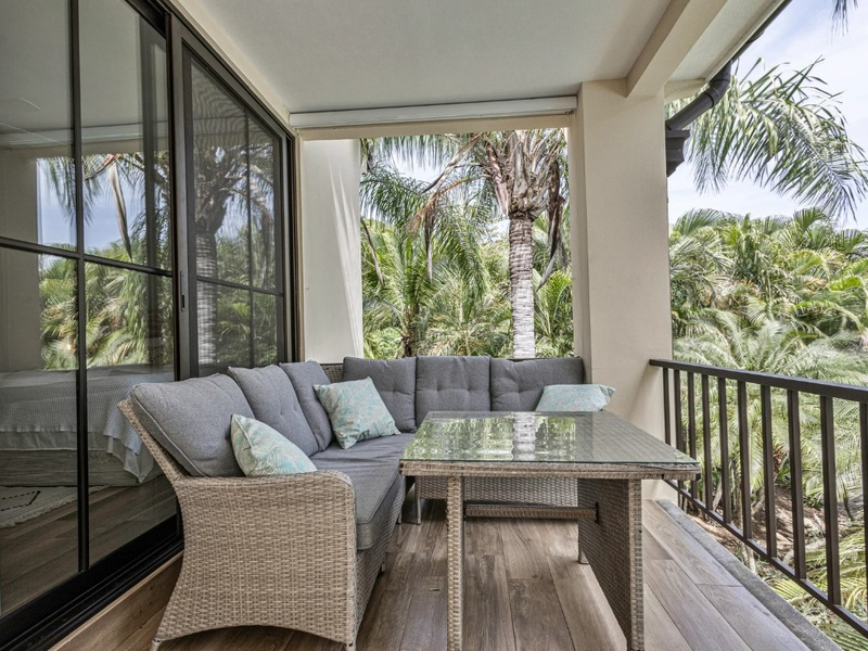 Step onto the oversized balcony and enjoy views of palm trees and the shimmering pool—elevated for privacy yet perfectly connected to the tropical surroundings.