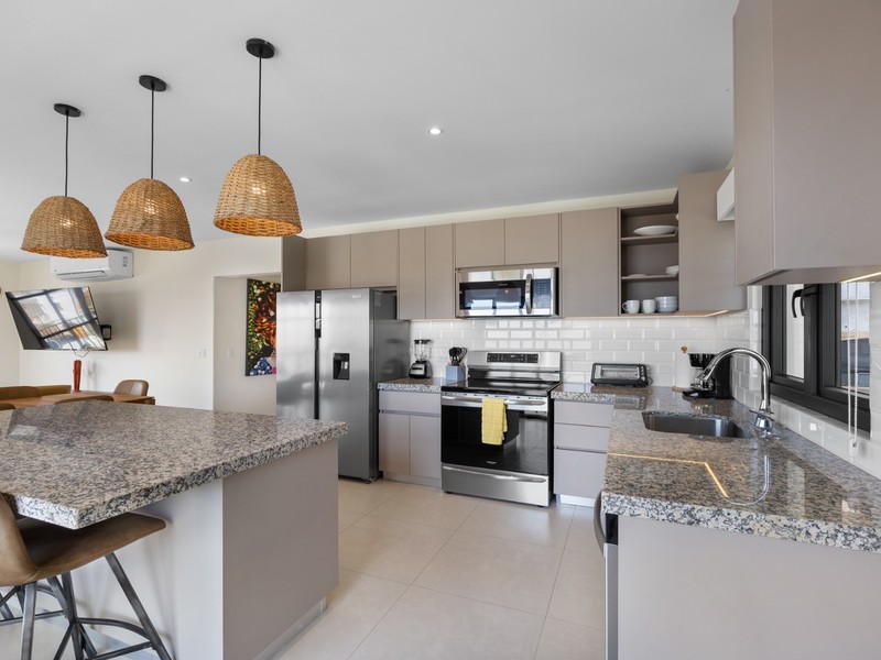 Inside, you can find a bright and breezy open-concept layout with refined finishes, natural materials, and a tasteful palette. The spacious kitchen and living area flow out onto a private balcony where sweeping ocean vistas set the scene for unforgettable mornings and magical sunsets.