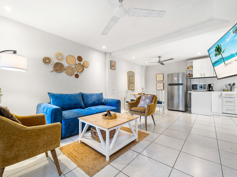 This bright, impeccably styled 3-bedroom condo is the rare combination of location, value and income potential, the most affordable three-bed option in town and an ideal turnkey rental or family home. You’ll love the airy, open living area (styled with pops of color and quick-rent appeal), the modern white kitchen with stainless fridge and plenty of storage, and the comfortable bedrooms that already feel like a guest magnet, each with AC and cooling fans so renters and owners sleep easy. The unit is being sold furnished and ready for bookings, which means minimal work and immediate cash-flow potential.