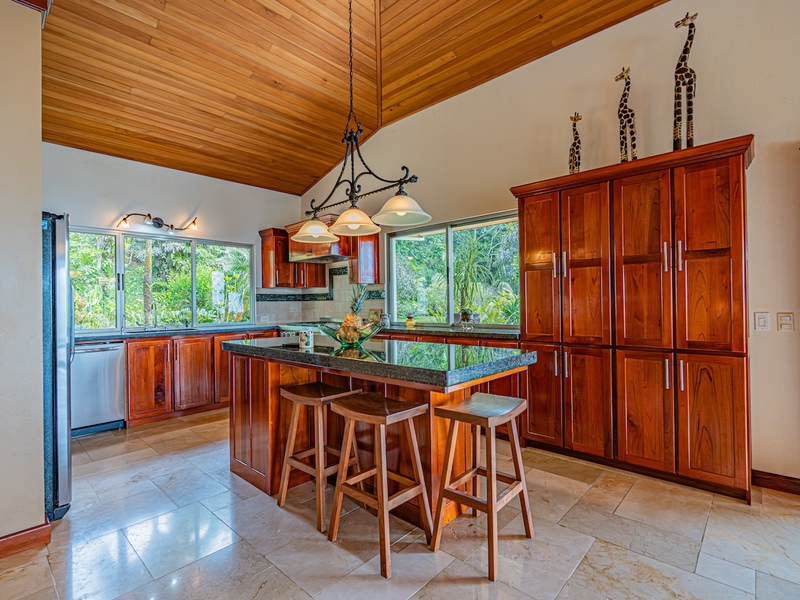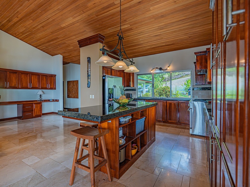 Gourmet kitchen with granite countertops, solid wood cabinetry, quality appliances, and excellent cross-ventilation—ideal for entertaining