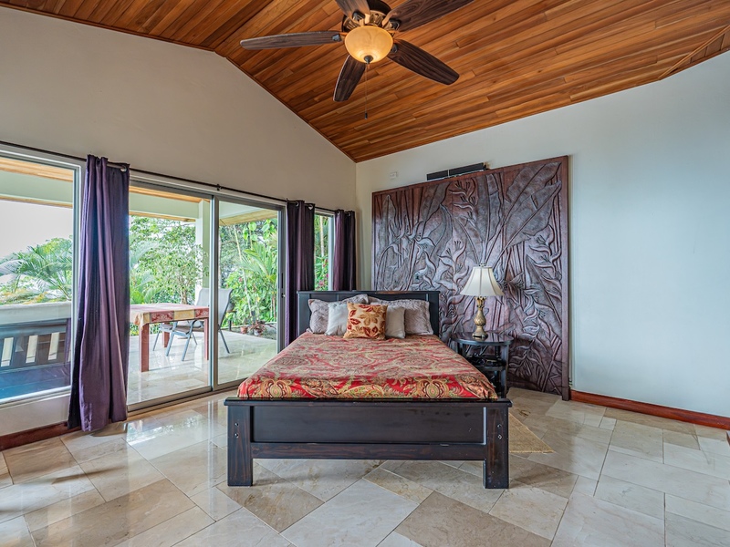 Primary suite retreat with en-suite bathroom, walk-in closet, private terrace access, and a hand-carved Balinese hardwood bed, a true statement piece
