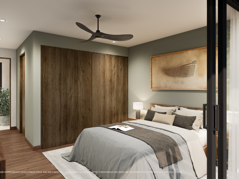 This single-level villa features 156 m² (1,680 ft²) of interior living space with three bedrooms, three bathrooms, and a powder room. A spacious central social area creates seamless flow between living, dining, and outdoor spaces, while large windows frame garden views and bring natural light throughout the home. Each villa includes two exterior parking spaces and sits on a generous lot ranging from 611–1,210 m² (6,575–13,025 ft²).