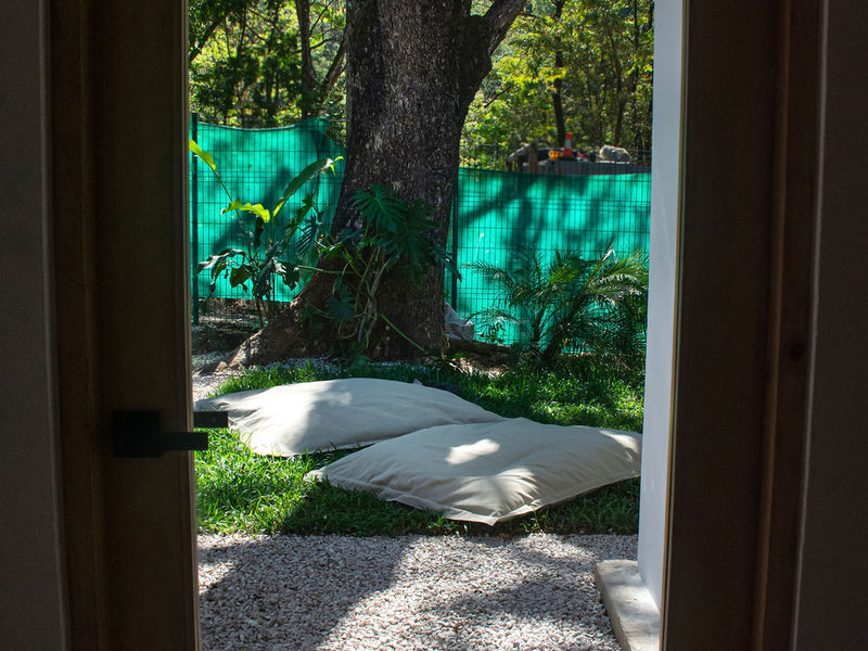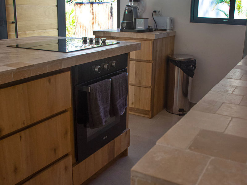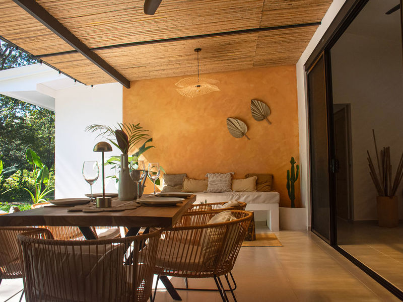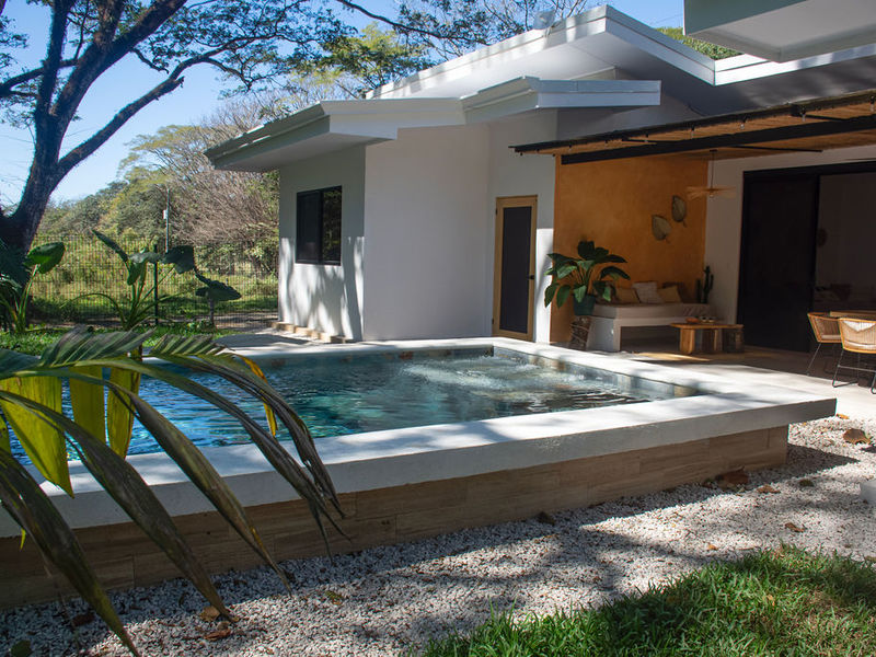 The property features air-conditioned interiors, a private swimming pool, a charming garden, and a large mature Guanacaste tree adding shade and character. Outdoor spaces are designed for comfort and relaxation.