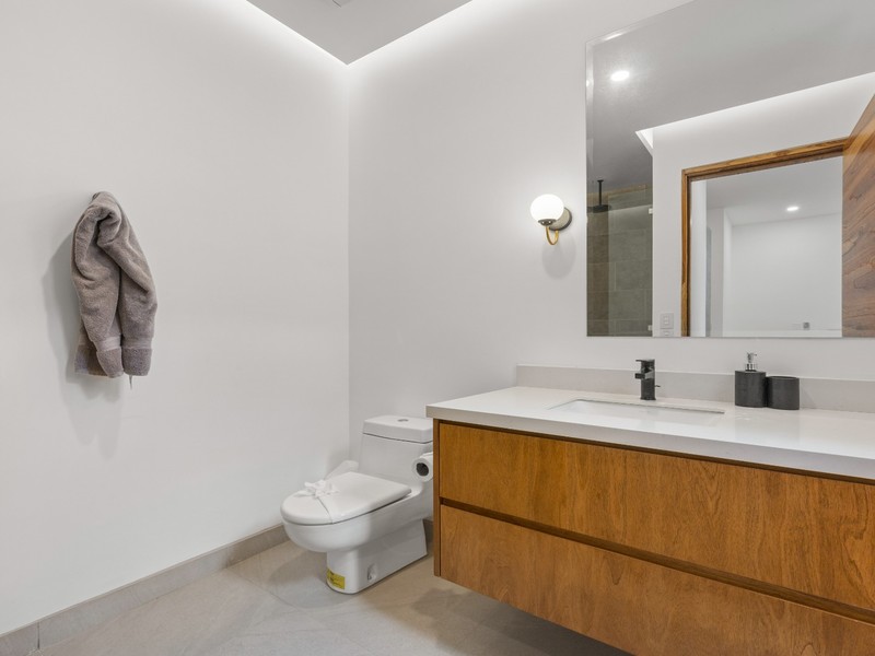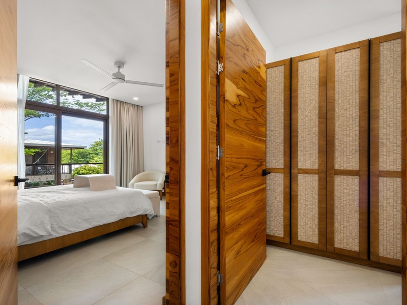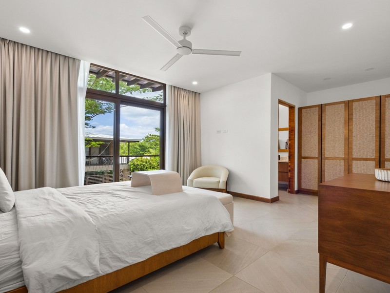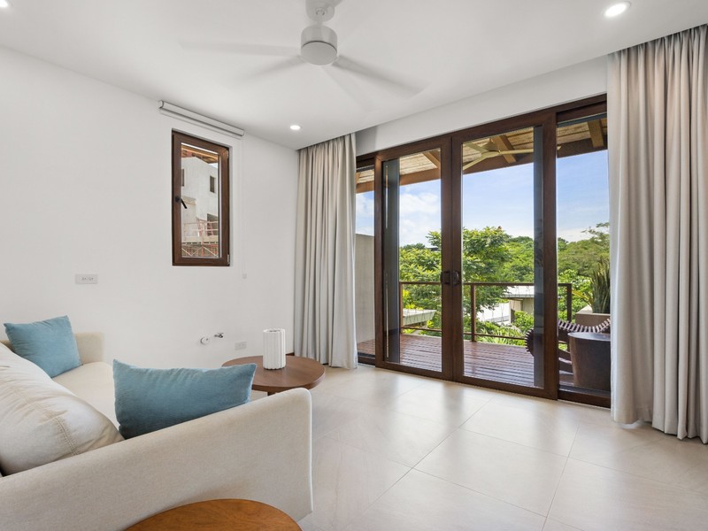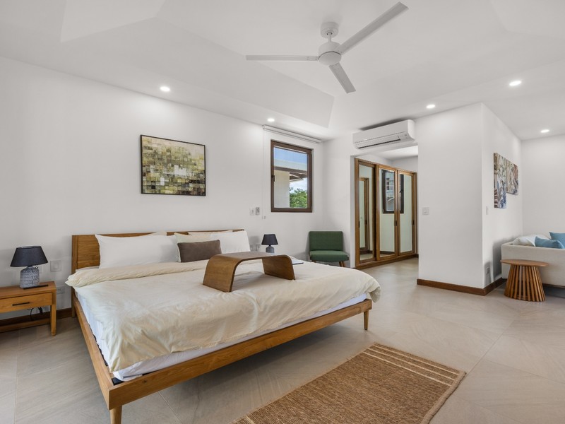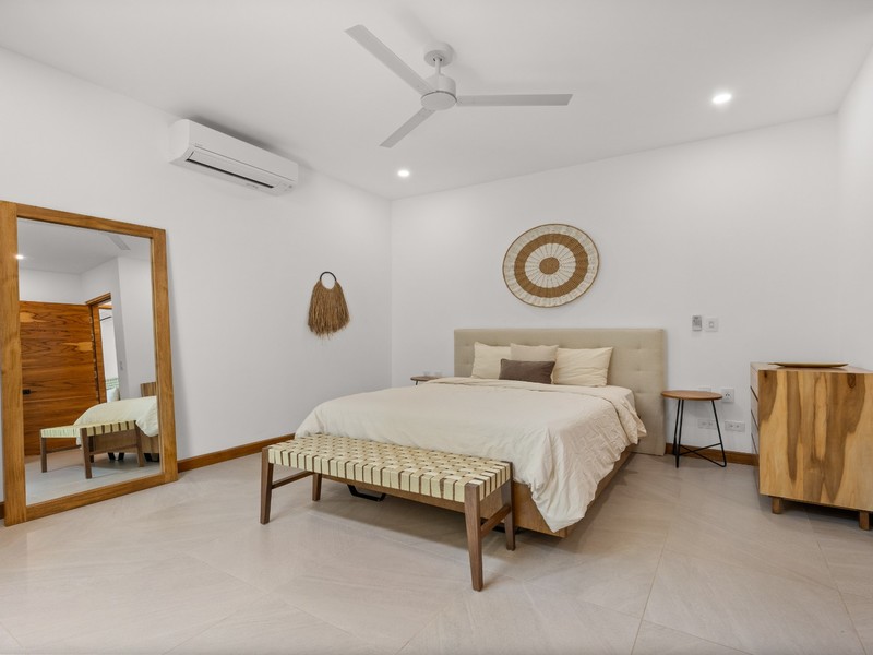 Each bedroom is thoughtfully designed with porcelain flooring and premium finishes. The primary suite offers a private balcony with partial views toward Langosta Beach, the second bedroom includes its own balcony, and the third bedroom features a private indoor garden, ideal for a yoga space or reading area.