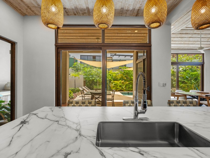 The home features a bright open-concept living area filled with natural light, complemented by modern finishes and a neutral color palette that creates a relaxed and elegant atmosphere. The sleek contemporary kitchen includes high-end appliances, custom cabinetry, and a central island with breakfast bar, flowing seamlessly to a covered patio and terrace for indoor-outdoor living.
