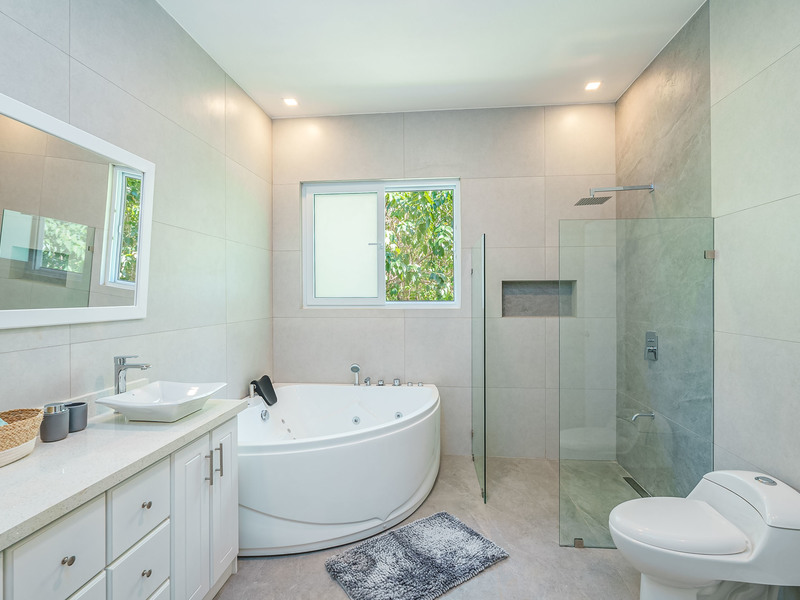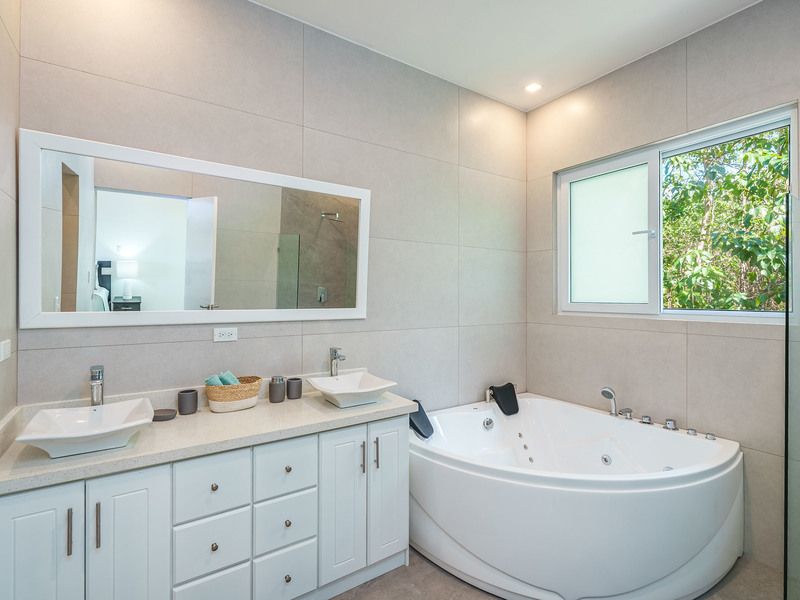 The Master Bedroom suite, spanning the entire second floor, is a haven of luxury and tranquility. The oversized bedroom boasts a spacious sitting area and opens onto two private terraces. One offers stunning views of the pool, while the other overlooks the lush forest, providing a serene escape. The master bathroom is truly indulgent, featuring a two-person jacuzzi tub, a separate rain shower, and a spacious walk-in closet.