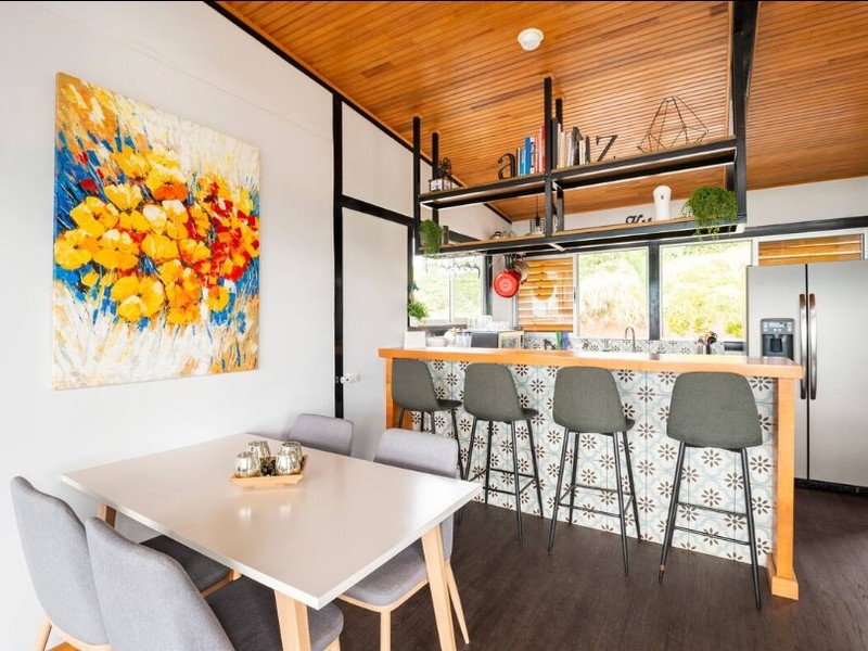 Nestled in a serene coffee plantation in Turrialba, Costa Rica, this fully furnished 3-bedroom, 2.5-bathroom modern home is for sale at $319,000 USD. Spanning a 5,000 m² lot with a 165 m² construction area, this property offers breathtaking 180-degree views of the Turrialba Valley, showcasing the majestic Turrialba and Irazú Volcanoes and downtown Turrialba. Ideal for those seeking sustainable living, tranquility, and proximity to nature, this chic retreat combines comfort and stunning design.