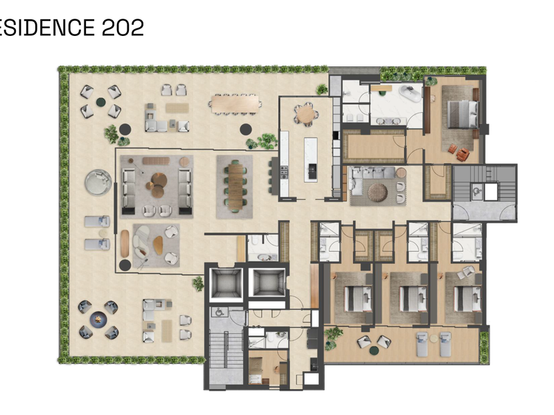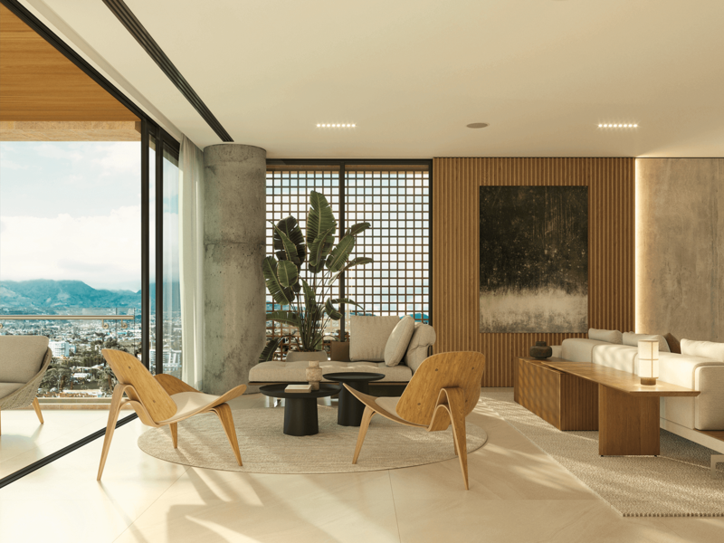 Residence 202 at Arcadia Central Park is an expansive luxury residence designed to showcase sweeping city and mountain panoramas through 270-degree exposure. Defined by its generous scale and outdoor living, the residence features an oversized triple-exposure terrace complemented by a secondary balcony, extending the living experience across multiple outdoor environments within Central Park Escazú.