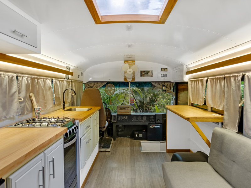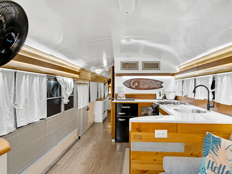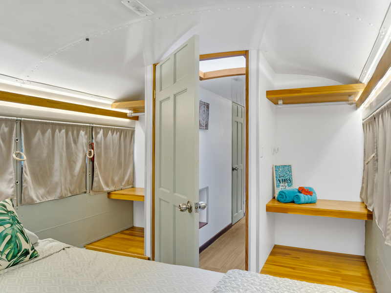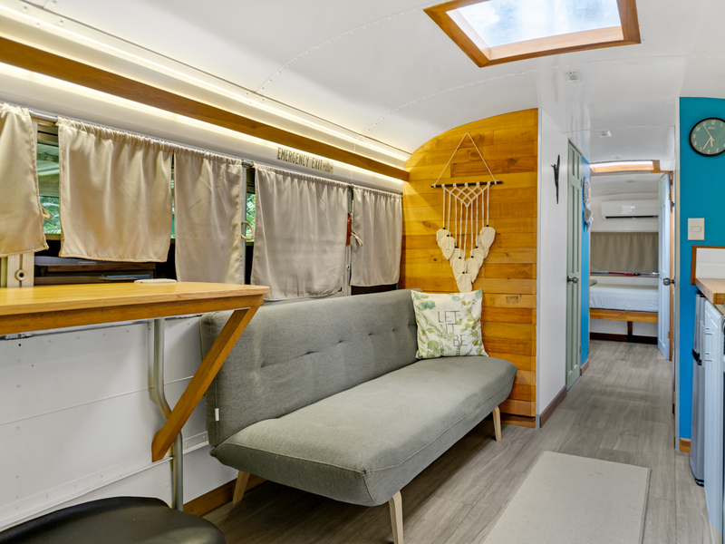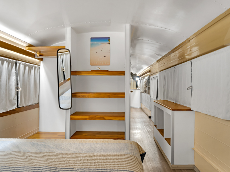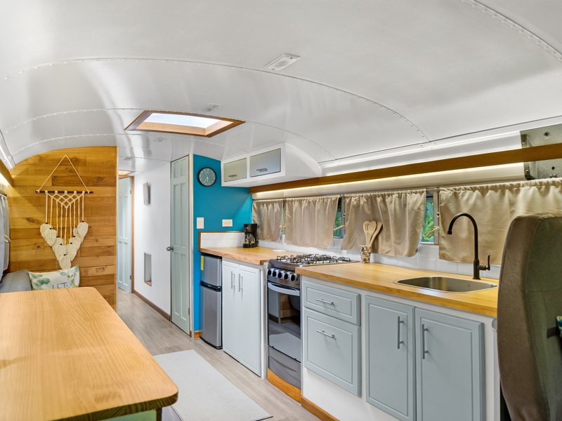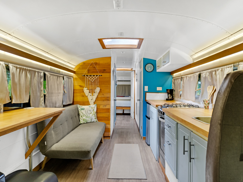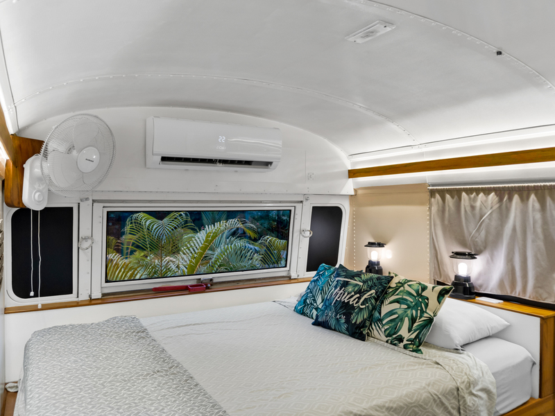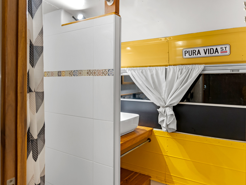 Four creatively transformed buses provide singular and cozy accommodations. Each unit encompasses a bedroom, private bath, complete kitchen, and personal outdoor terrace, creating an ideal setting for guests to savor the tropical ambiance with their morning brew.
