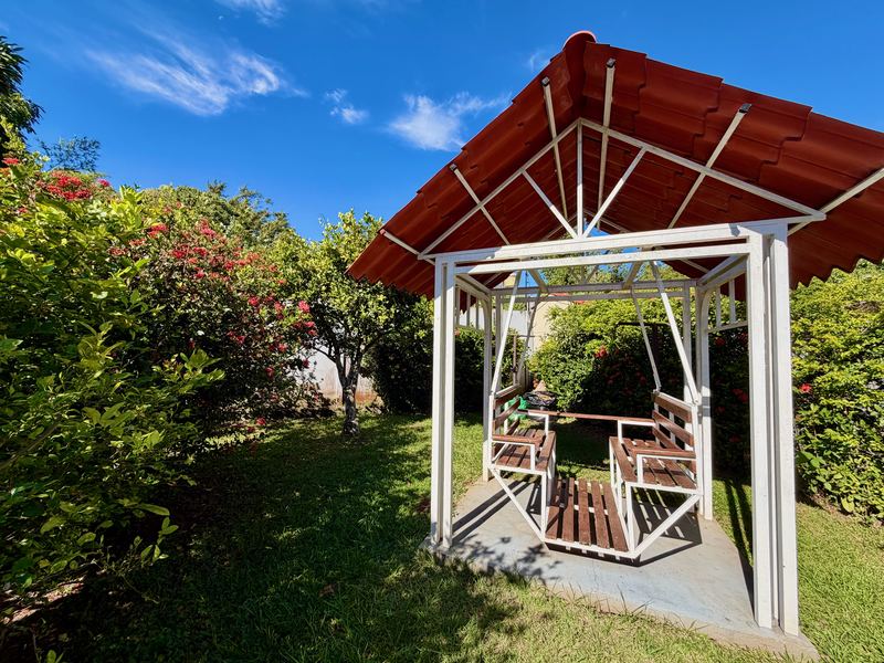 The laundry room is located in a separate small building. At the back of the property, a lovely garden with plants and fruit trees creates a pleasant outdoor space, with enough room to add a swimming pool. A covered carport for two vehicles and a water reserve with pump add convenience and peace of mind.