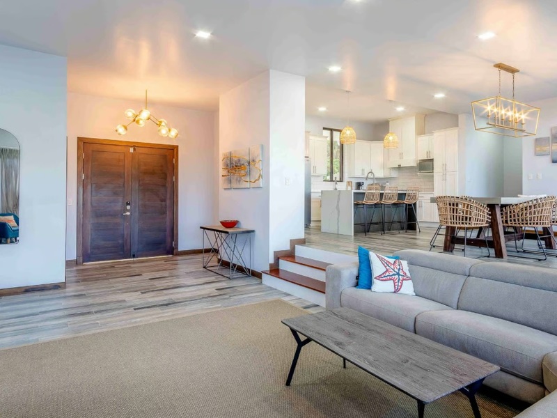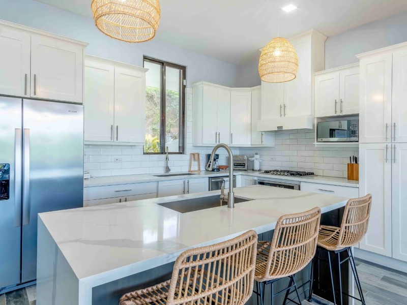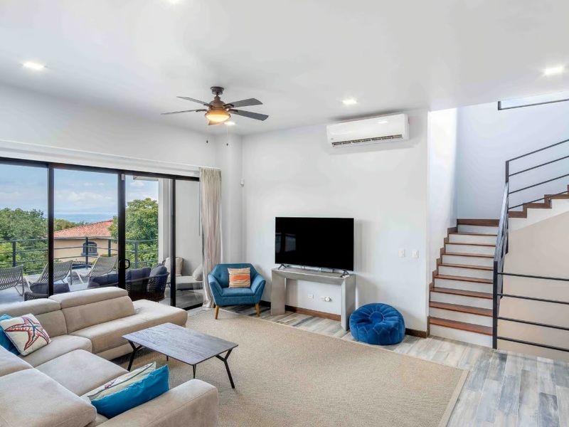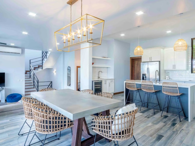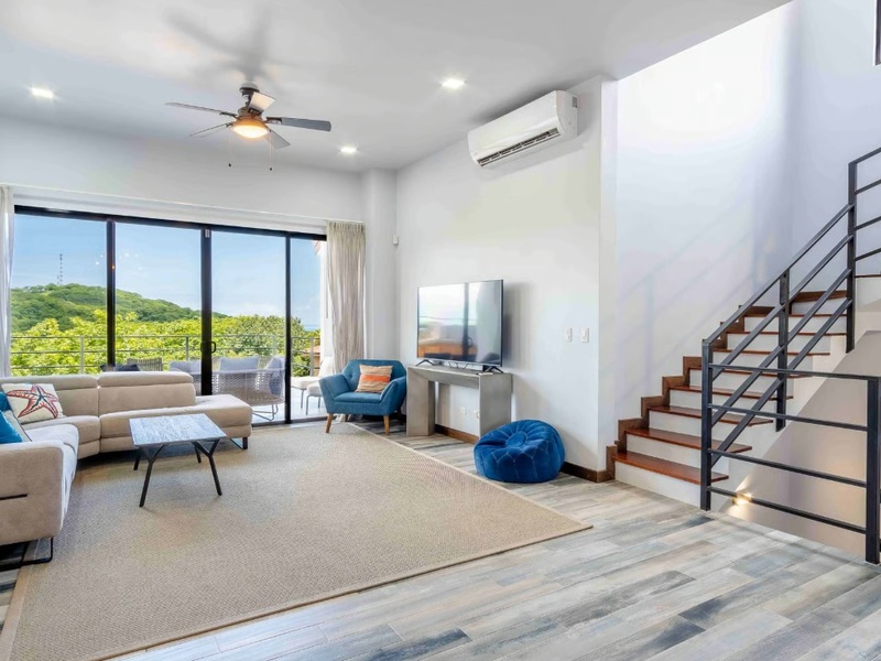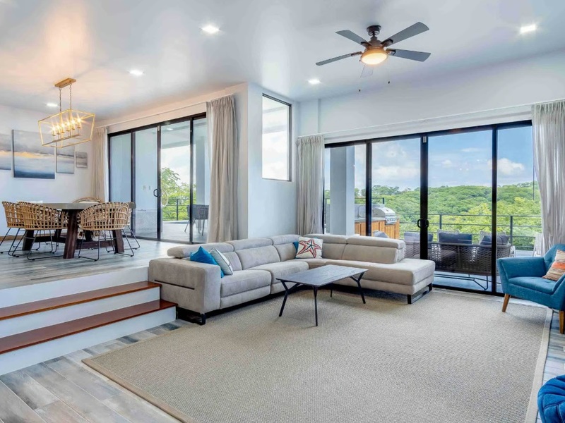 Recently built within the last three years, the home blends modern design with warm Costa Rican charm. The open-concept first floor features a spacious living room, dining area, and sleek kitchen, all flowing seamlessly to an expansive outdoor patio through large glass doors.