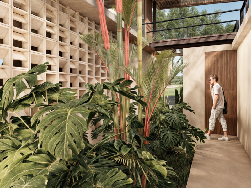 Water conservation is a cornerstone of Jardín Eterno. Rain gardens filter and recycle water onsite, while outdoor walkways and circulation areas connect residents with nature, reducing energy usage.