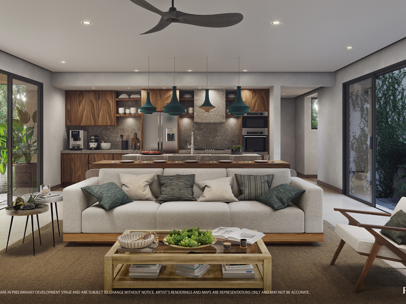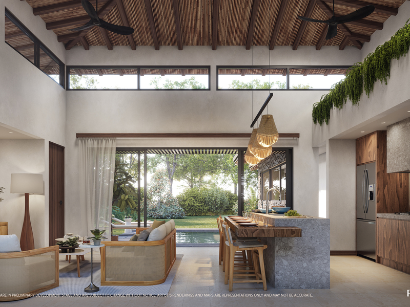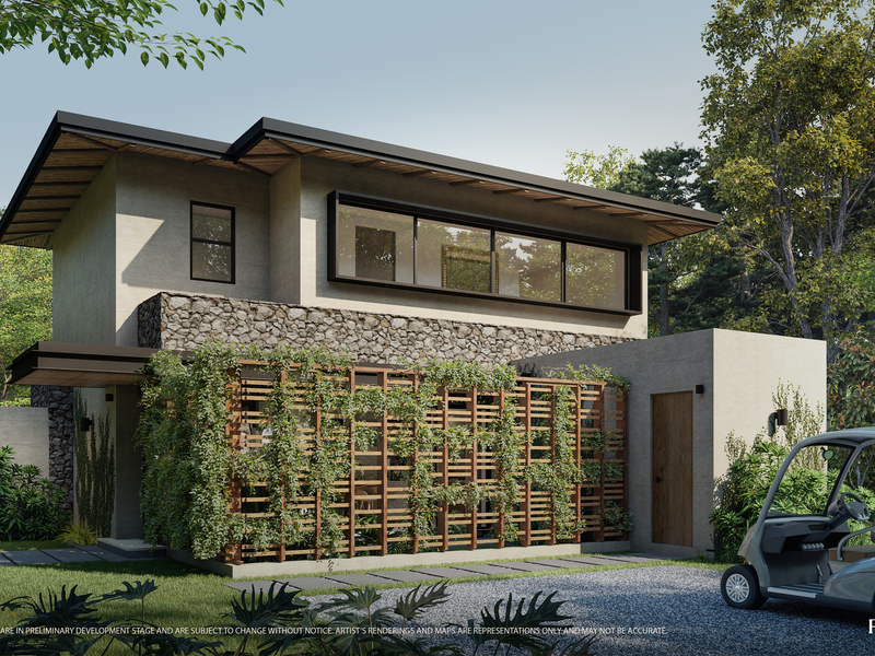 This two-story villa features 225 m² (2,420 ft²) of interior living space with four bedrooms, four bathrooms, and a powder room. The main level is designed for open, breezy social living, while upper-level bedrooms offer added privacy and elevated views of the natural surroundings. Each villa includes two exterior parking spaces and sits on a landscaped lot ranging from 602–852 m² (6,480–9,170 ft²).