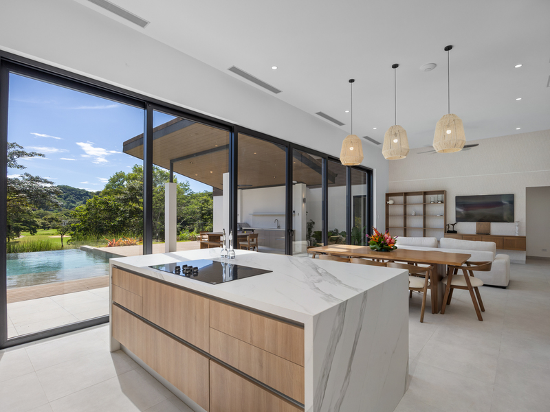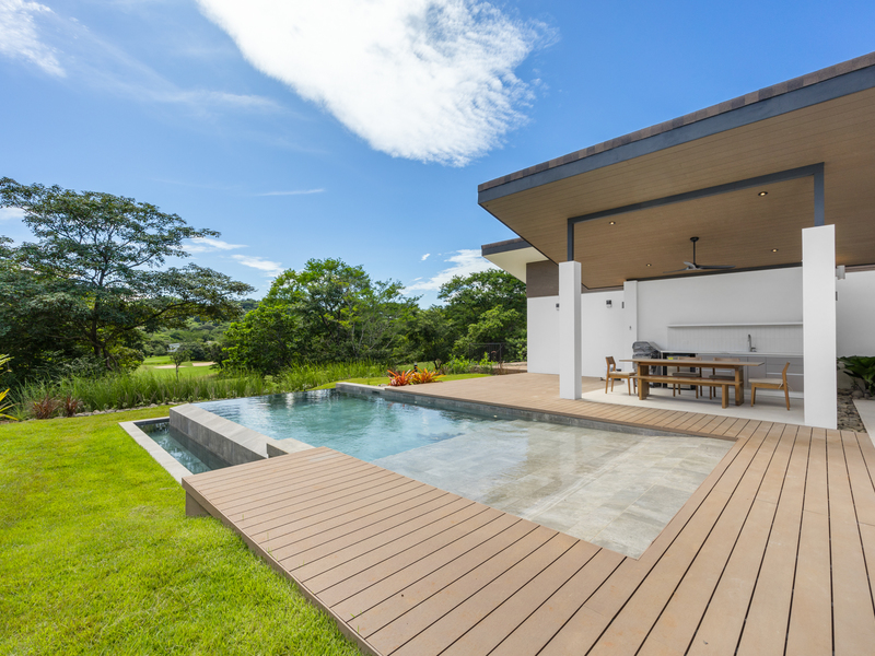 The home's outdoor area is designed for ultimate relaxation, with a stunning infinity pool that overlooks the golf course, a large covered kitchen, BBQ and dining area for outdoor dining, and a modern kitchen with granite countertops and wood cabinetry. It's only a 5-minute walk from the Beach Club and the famous white sands of Playa Conchal beach, making it the perfect place for beach lovers.