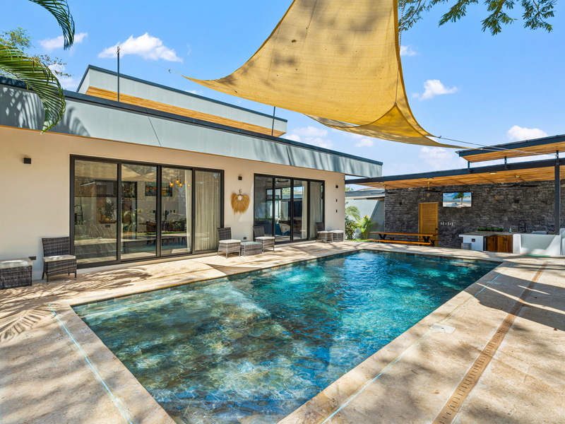 The outdoor living area is the true centerpiece of the home, featuring a large private swimming pool with both shallow and deep sections, an outdoor BBQ and yoga area, a pergola with seating, two outdoor showers, and a lush tropical garden. Abundant natural light and airflow enhance the connection between indoor spaces and the outdoors, creating a relaxed and inviting atmosphere.