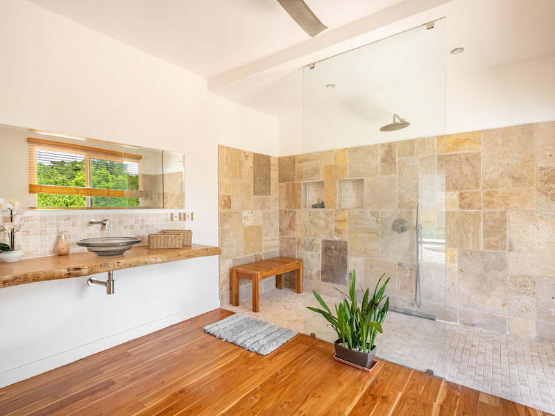 Spa-inspired bathrooms with travertine marble showers and mango wood countertops