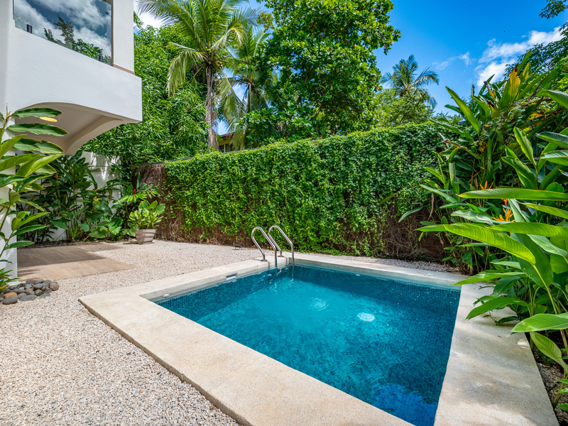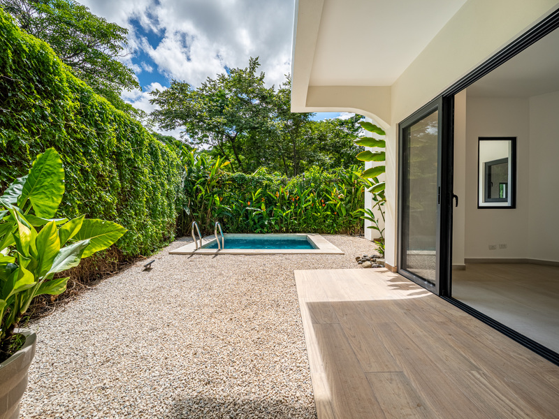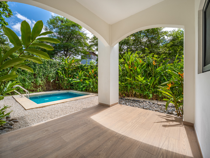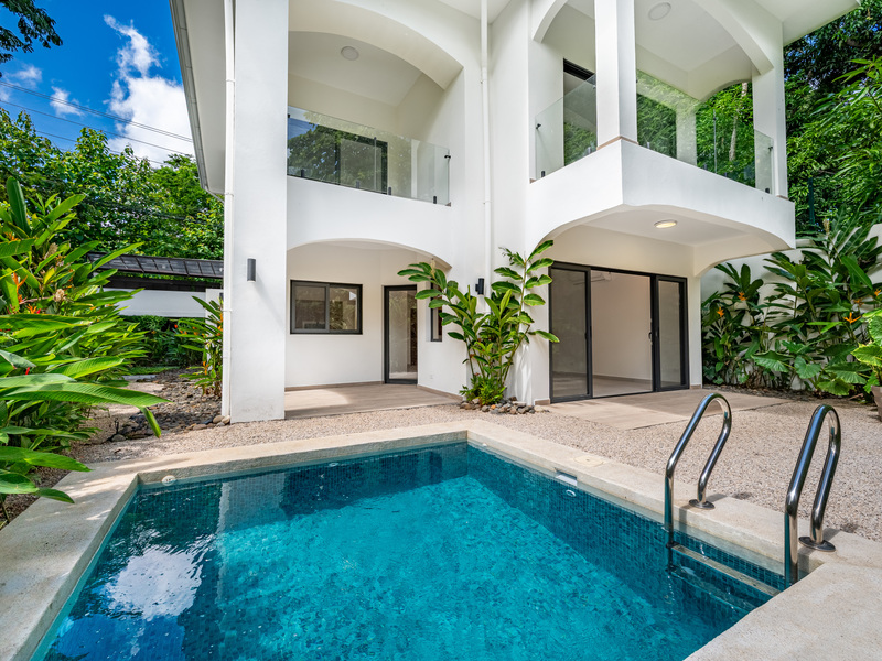 Outdoor living is enhanced by a plunge pool and carefully designed gardens with an automatic drip irrigation system. Additional amenities include a two-car electric garage, smart lighting, a video intercom system, and energy-efficient elements such as inverter air conditioning units and LED lights. The master bedroom is spacious, featuring a walk-in closet, double sinks, and a glass-enclosed shower. A bedroom on the ground floor adds convenience and flexibility.