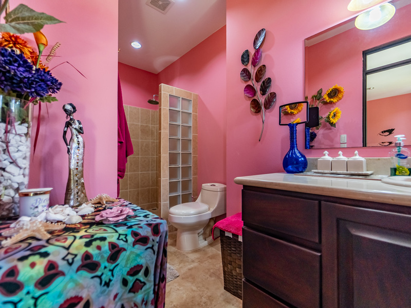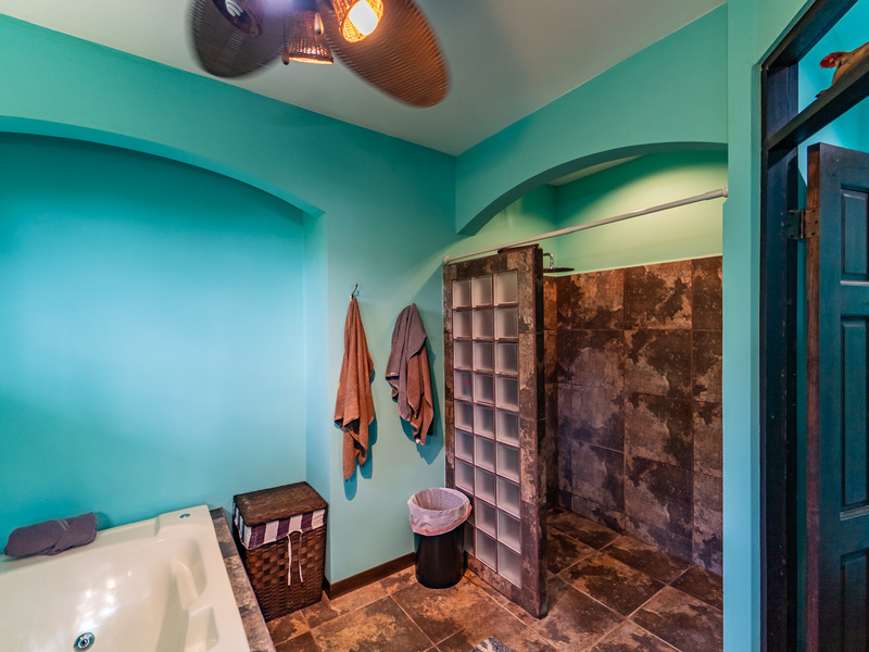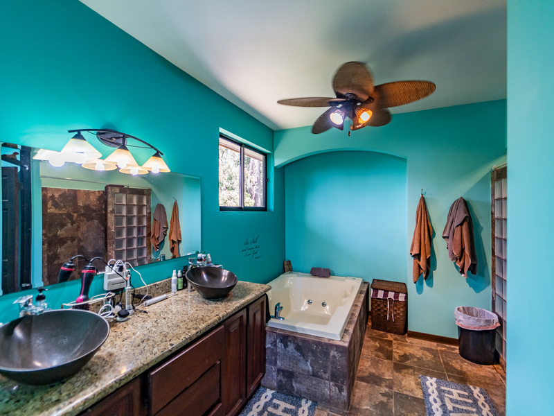 The custom-built main house, completed in 2016, features an open floor plan with expansive covered outdoor living spaces, three spacious bedrooms with en-suite bathrooms, a large kitchen with two refrigerators, an office/study, and a living room with an 85" smart TV. Designed for comfort, all rooms have A/C and ceiling fans, while floor-to-ceiling windows frame the stunning views. The property also includes a uniquely shaped infinity-edge pool with a waterfall and jacuzzi tub, all equipped with state-of-the-art automated pump systems.