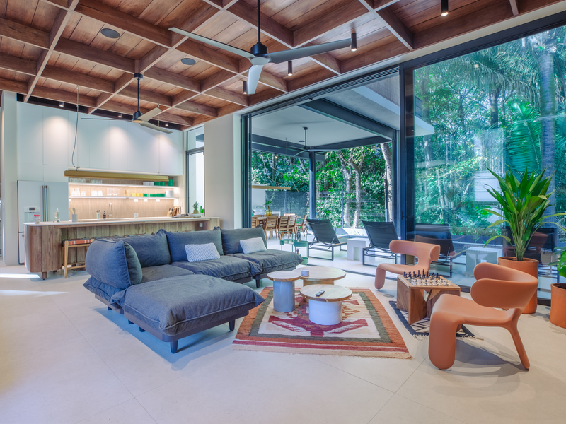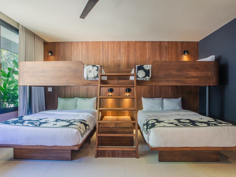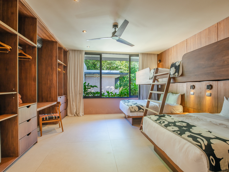 A custom bunk room adds a playful, functional touch—perfect for kids, guests, or surf trips with friends. Oversized overhangs, skylights, wood screens, and cross ventilation keep the space naturally cool and open to the outdoors, while soft light and thoughtful details invite ease and comfort.