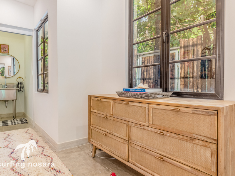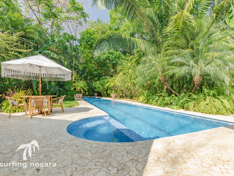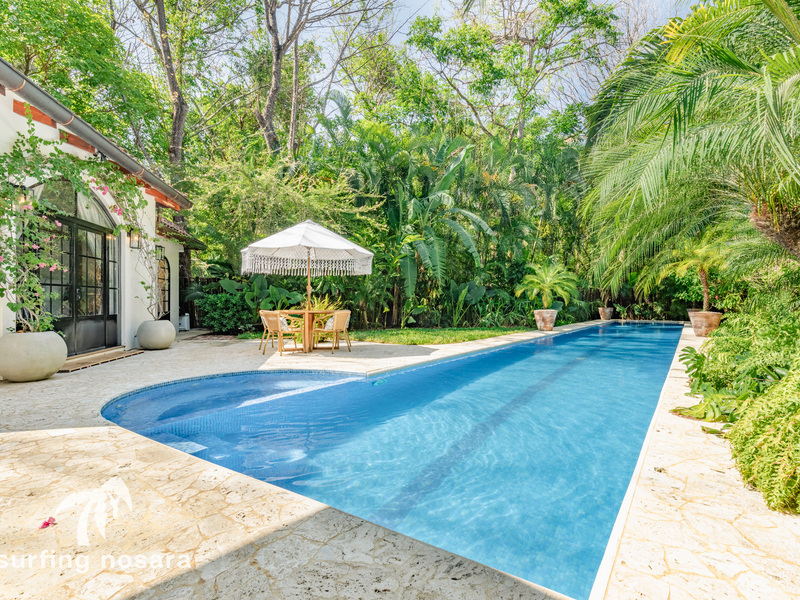 This exquisite Spanish-style villa, complete with 4 bedrooms and 3.5 baths, is a designer's dream. Nestled in the heart of Guiones, it offers an unrivaled blend of convenience and natural beauty. Surrounded by lush, protected jungle, this property provides 360-degree privacy, allowing you to bask in the untouched wilderness while being only a stone's throw away from the town's finest dining and shopping establishments. A mere 3-minute stroll will lead you to the main beach entrance and the most coveted surf break in Nosara.