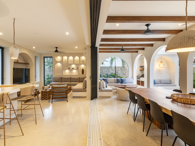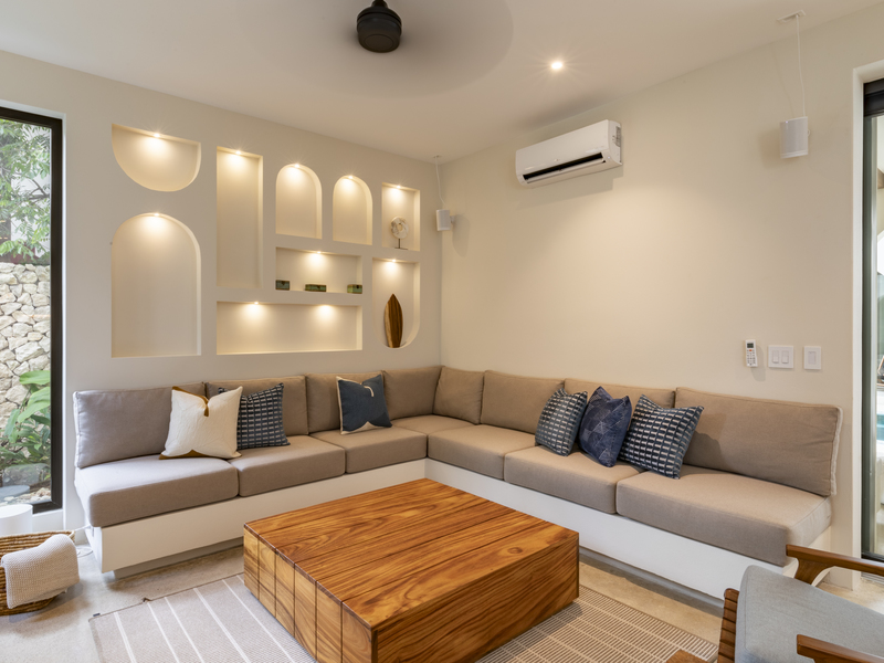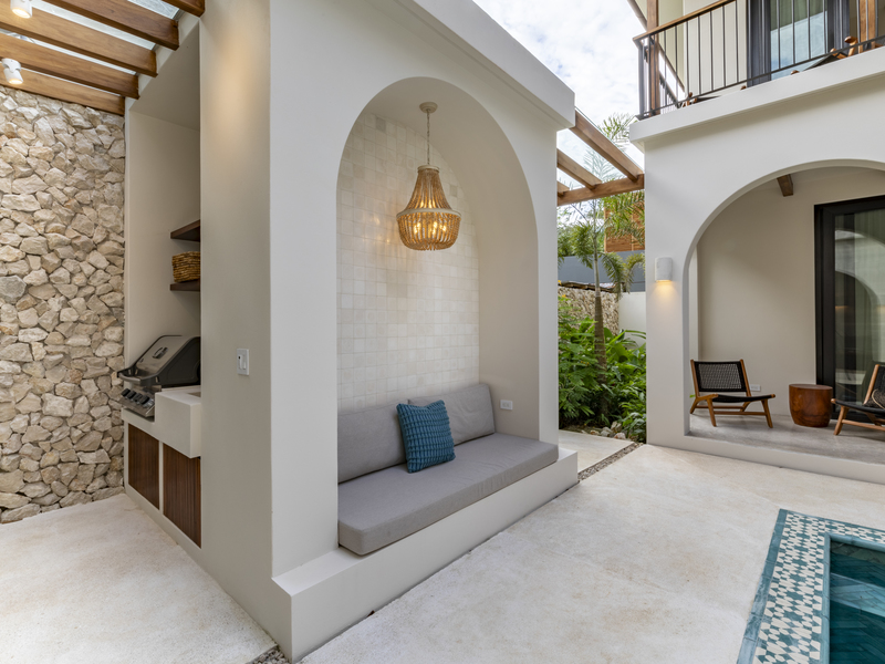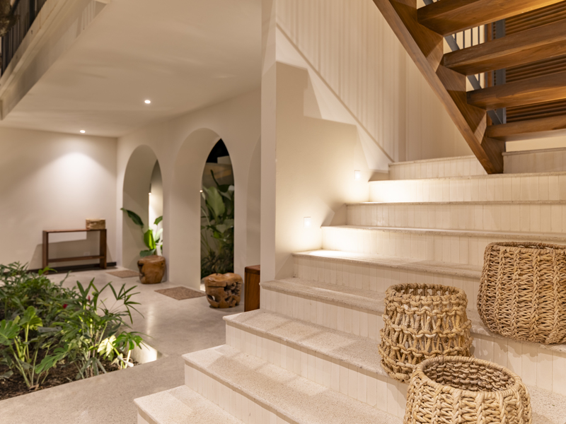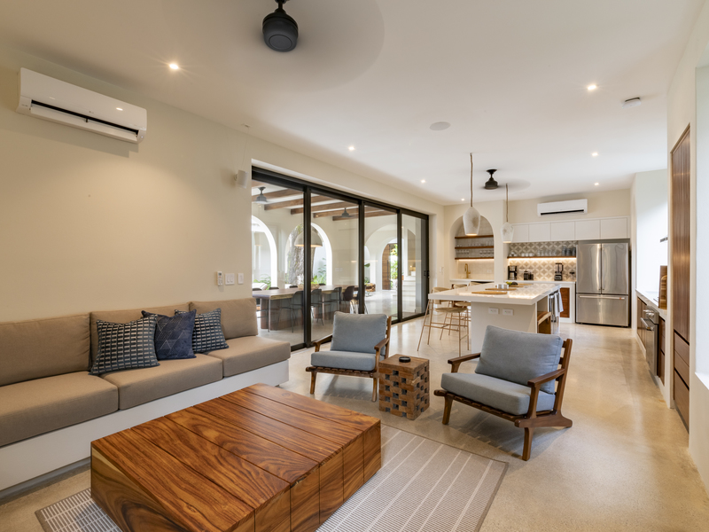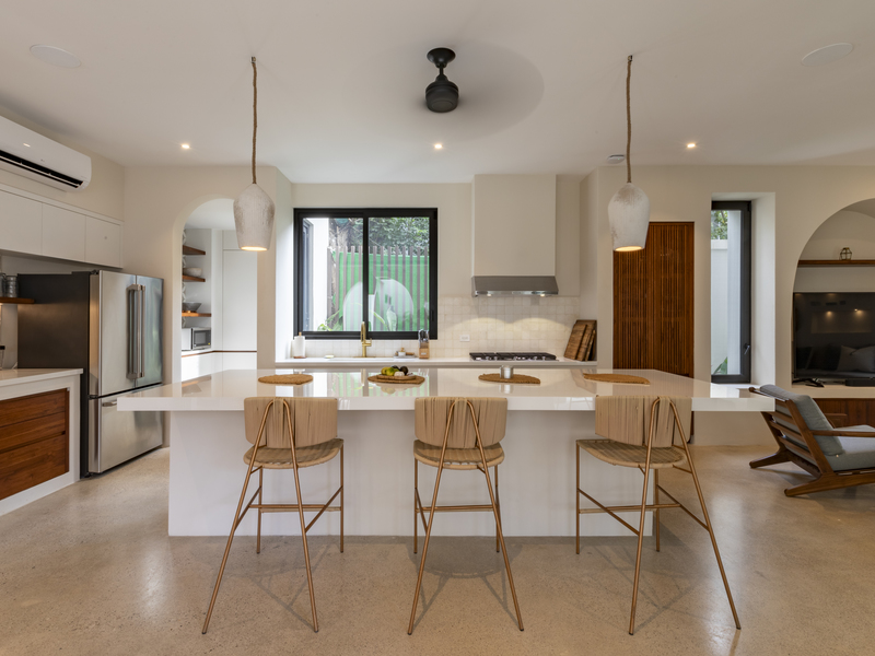 The villa features three beautifully appointed king en-suite bedrooms, each offering its own private terrace or balcony. These spacious retreats are designed with relaxation in mind, showcasing local craftsmanship and materials. Each bathroom is adorned with unique, handmade Costa Rican tiles and stocked with luxurious Miru bath products and hairdryers, while plush Parachute towels provide the ultimate comfort. Thoughtful touches throughout include air conditioning, ceiling fans, and handcrafted wood closets with secure storage for your valuables. The beds, made from beautiful local wood feature premium Jiron US-sized mattresses and incredibly soft 100% cotton Parachute sheets, promise restful nights after days spent exploring or surfing.