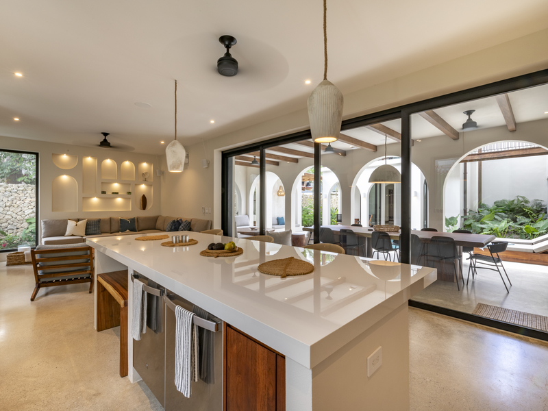 The heart of the home is the gourmet kitchen, which effortlessly blends modern design with the warmth of Costa Rican craftsmanship. Outfitted with state-of-the-art appliances, cookware, and dishware from Crate and Barrel, it’s perfect for preparing meals for two or twelve. Whether you’re cooking for a crowd or simply enjoying a quiet meal, the kitchen is fully stocked with everything you’ll need. Triple-filtered water, part of the eco-conscious water system, is available throughout the villa, and thoughtful details—like tumblers for cold drinks, reusable shopping bags, and a wine and beer fridge—ensure every need is met.