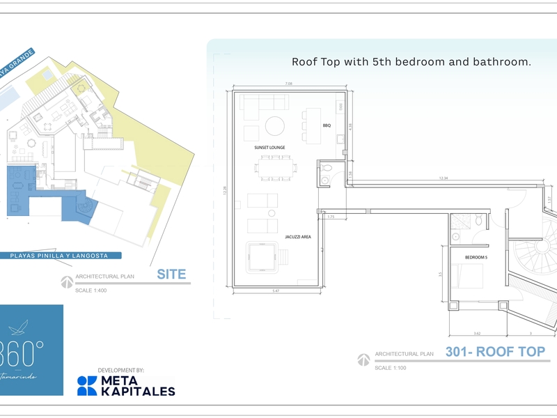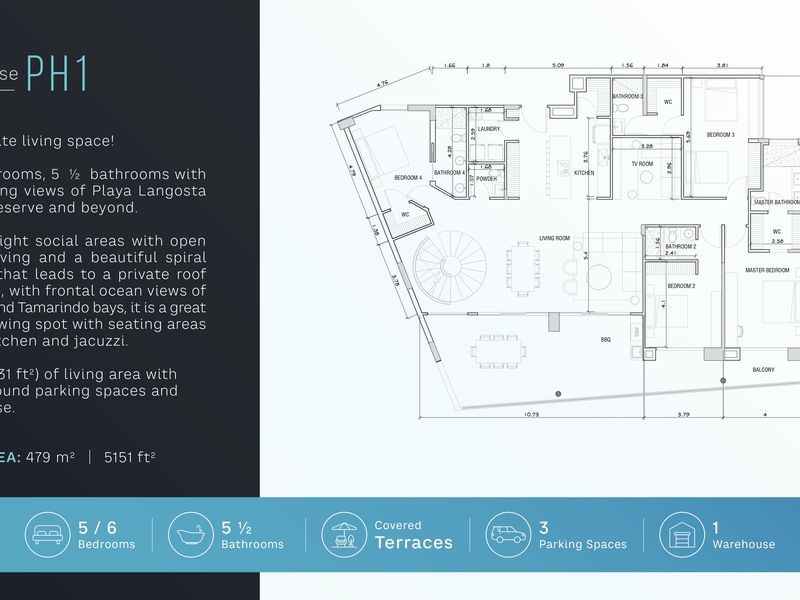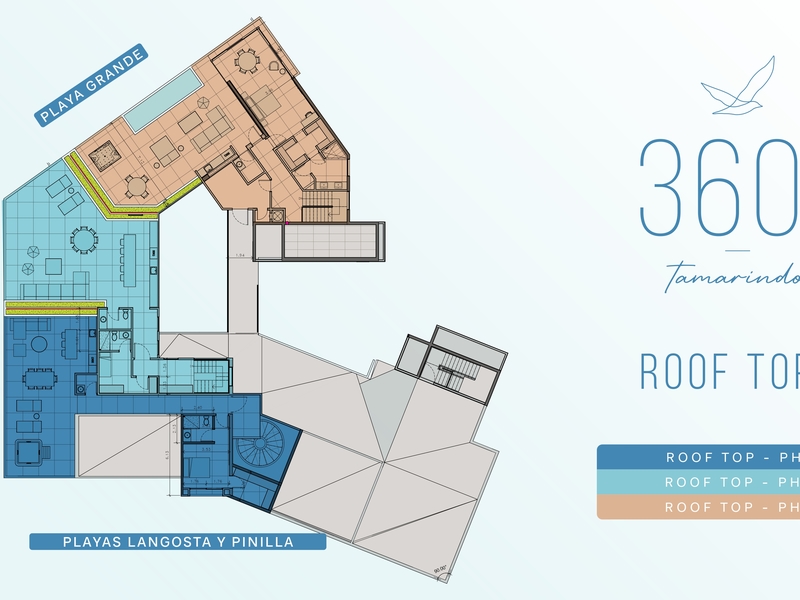 Elevate your lifestyle at Tamarindo 360, an exclusive sanctuary offering a stunning penthouse with panoramic ocean views of Playa Langosta and Tamarindo Bay. This expansive residence features 5 or 6 bedrooms, 5.5 bathrooms, and an open concept design with double height ceilings in the main living area. A striking spiral staircase leads to a private rooftop lounge, complete with a jacuzzi and seating for unforgettable sunset views. With 3,056 sq ft of living space and a total of 5,151 sq ft including outdoor areas, this penthouse includes 3 underground parking spaces and a storage bodega for added convenience.