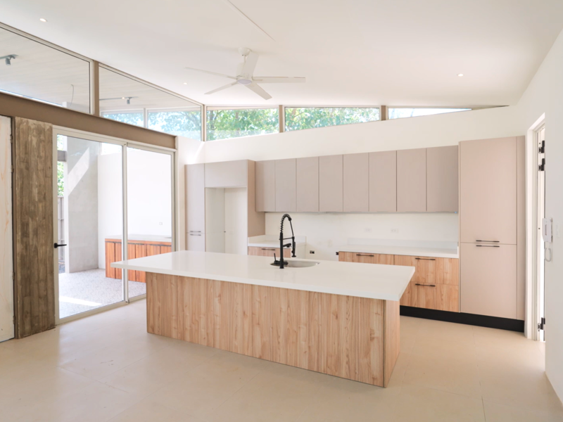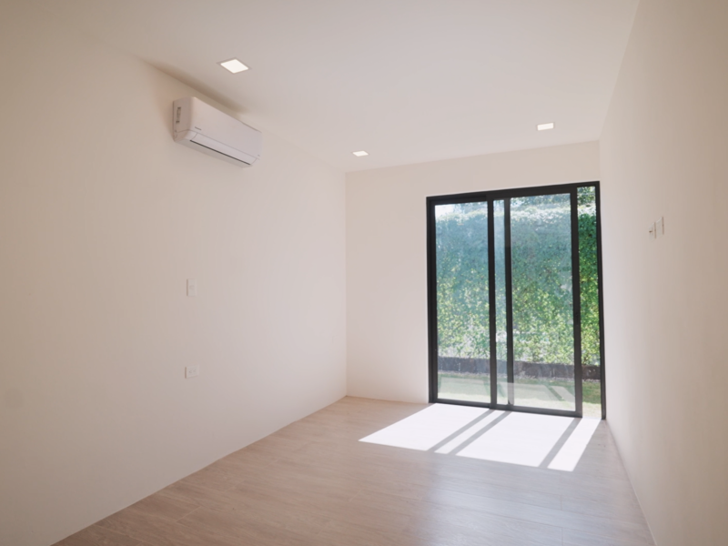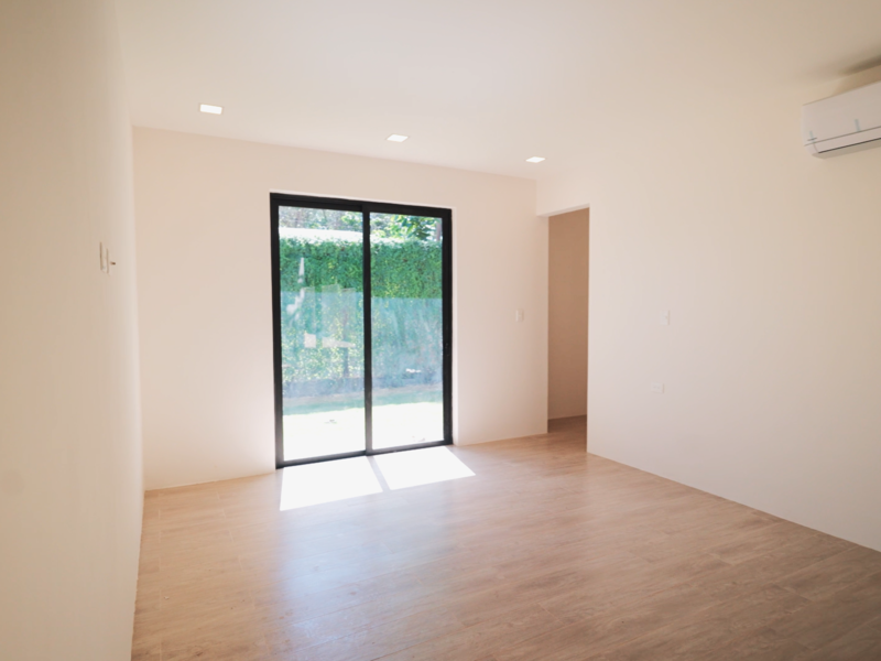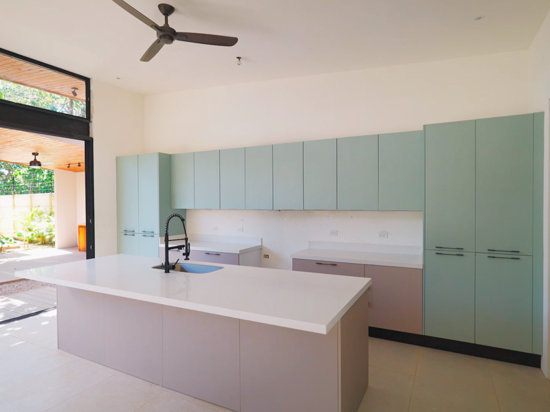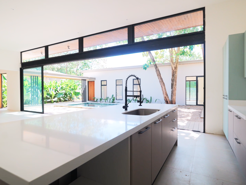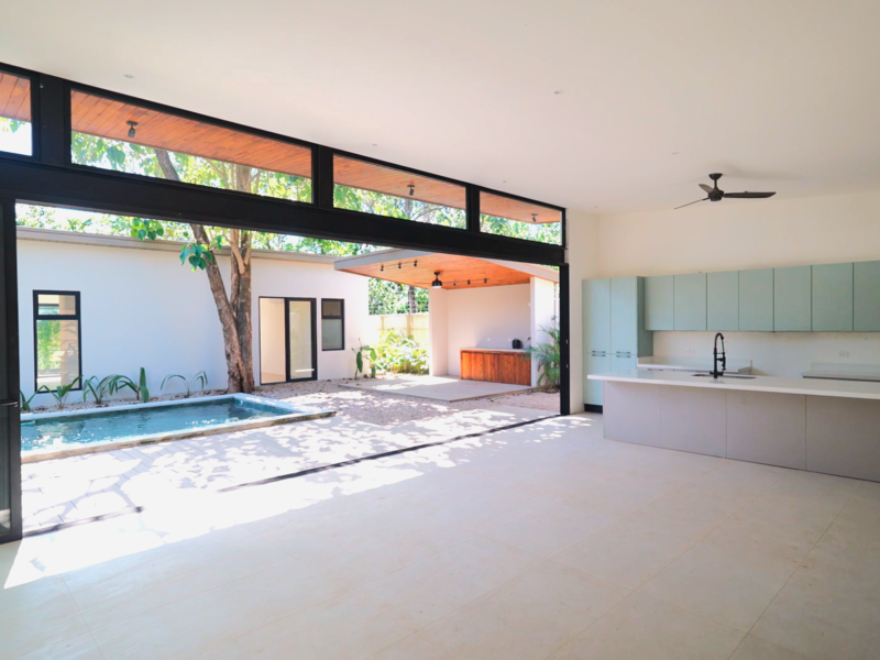 The main residence boasts three bedrooms and 3.5 bathrooms within a generous living space of 3,700 sq ft. The open-concept design effortlessly connects the kitchen, living, and dining areas to the inviting pool and barbecue space, easily accessible through expansive floor-to-ceiling sliding glass doors. Both homes feature cabinetry and countertops imported from Spain, adding a touch of luxury to their tropical modern aesthetic.