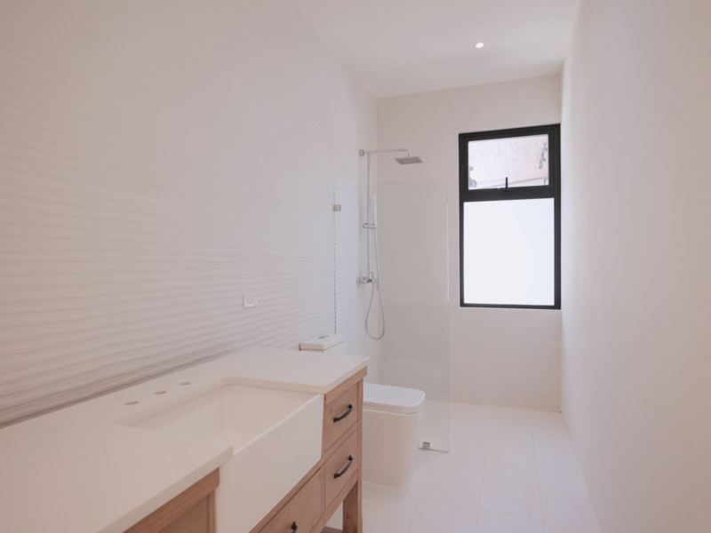 In the main house, the three bedrooms are thoughtfully arranged along a private hallway, enhancing their seclusion. Each bedroom comes equipped with ample closet space and en-suite bathrooms adorned with elegant tiles, with two bedrooms featuring internal gardens that create a serene, tropical ambiance in the showers.