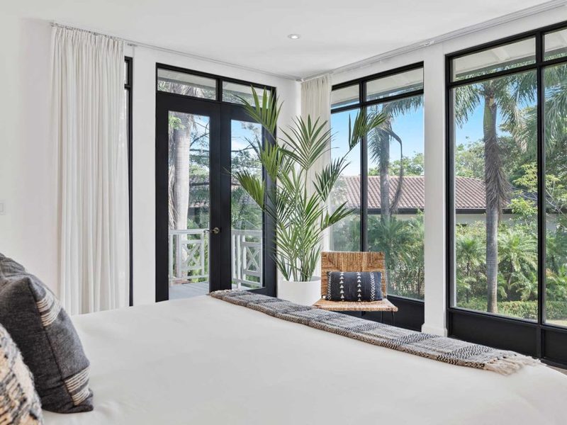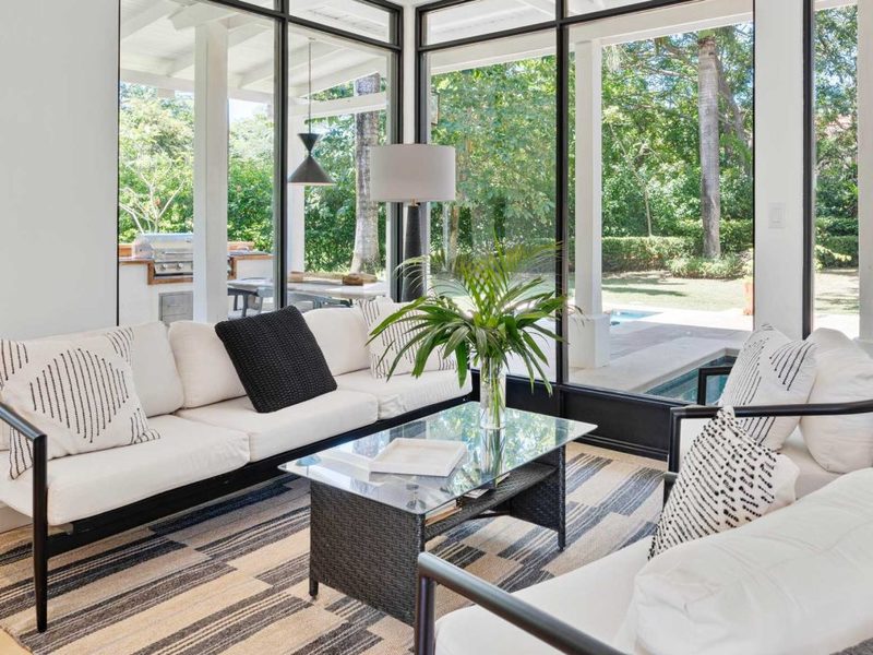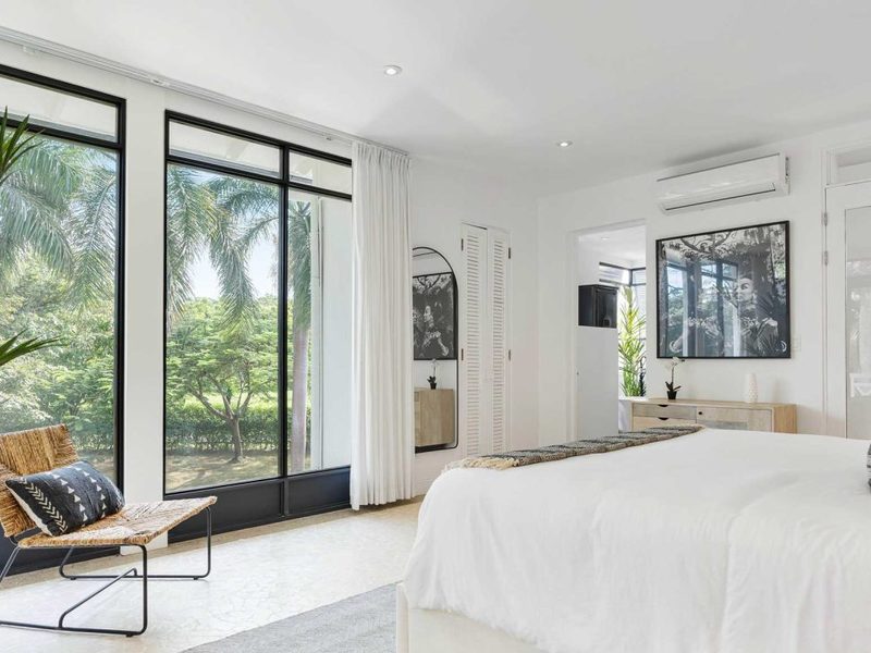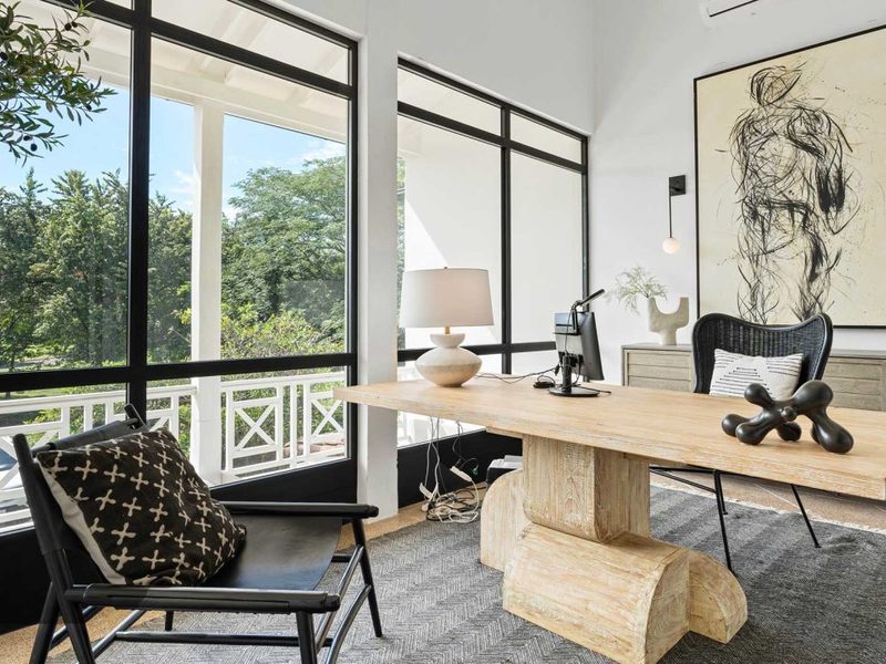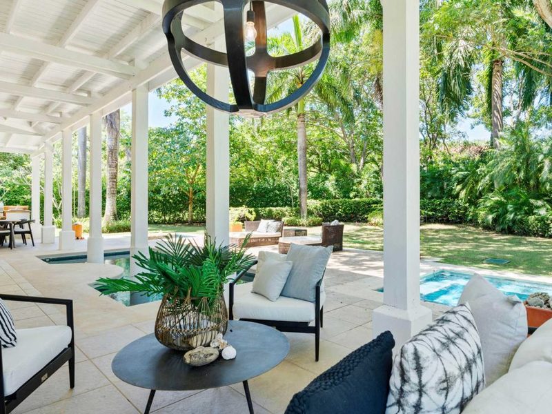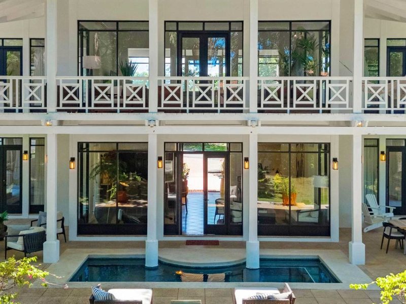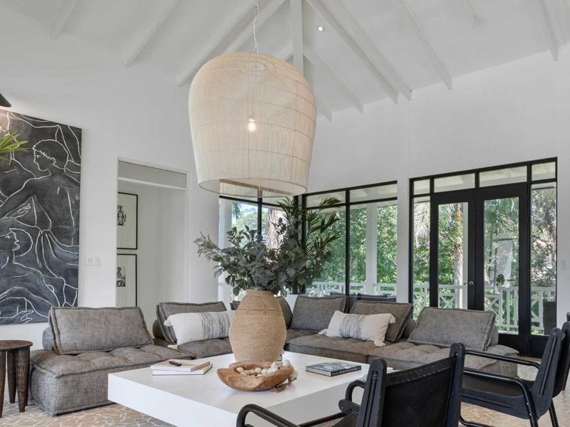 Crafted with premium materials, the home features high design, artisan ironwork, native hardwoods, and over 7,000 sq. ft. of covered living space. Designed with versatility in mind, the main property houses four master bedrooms and an Apartment. It features lovely tropical plantation-style architecture with hurricane shutters and a style that blends classic charm with contemporary elegance. Its symmetrical design creates a balanced and visually appealing facade, with central doors and windows framed by wide, uniform columns. This symmetry not only enhances the aesthetic appeal but also contributes to the home’s timeless allure. This interior design embodies a contemporary tropical design characterized by its use of natural materials, neutral tones, and a strong connection to the surrounding environment. The vaulted ceilings with exposed white-washed beams create an open and airy feel, enhancing the spaciousness of the spaces while maintaining a clean, minimalist vibe. Modern furniture pieces balance simplicity with comfort, ensuring a luxurious yet relaxed atmosphere.
