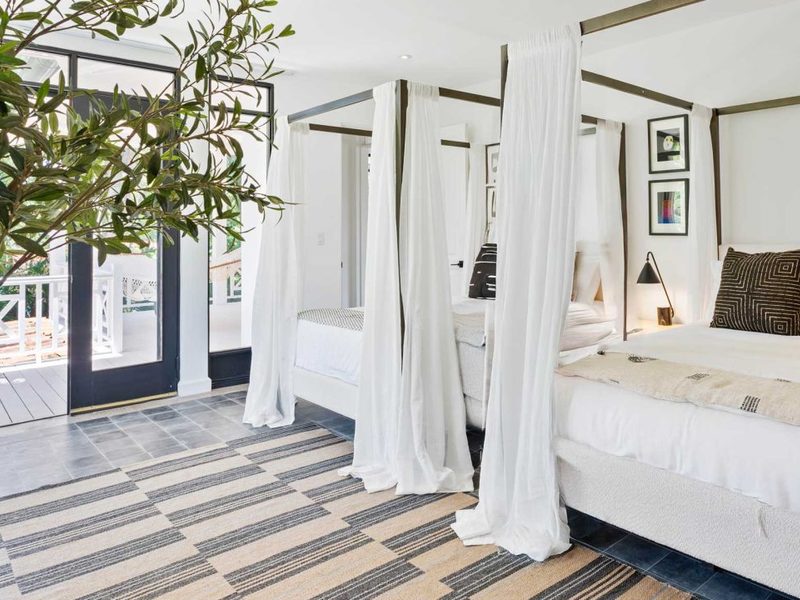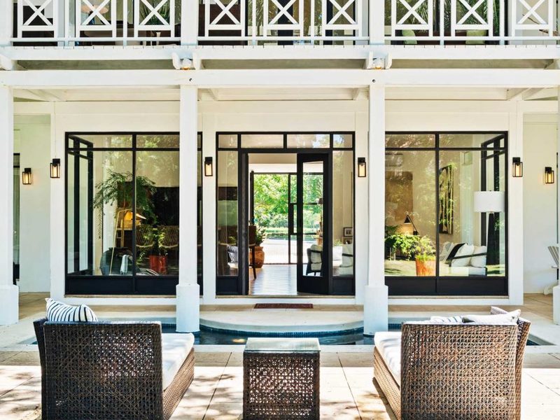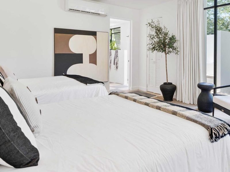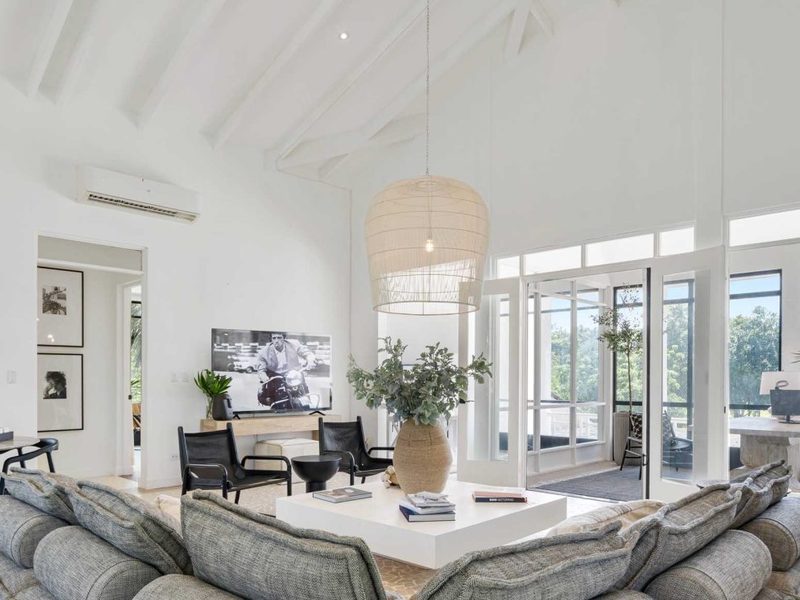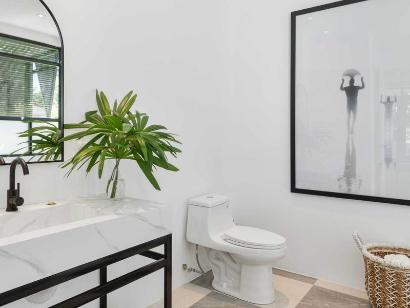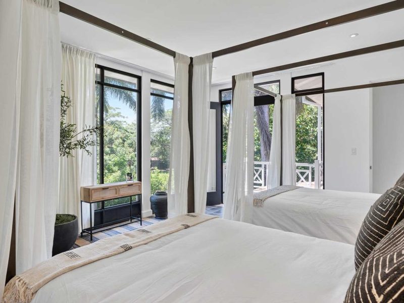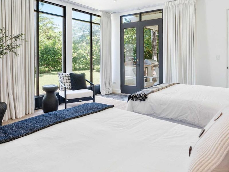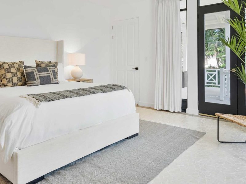 Crafted with premium materials, the home features high design, artisan ironwork, native hardwoods, and over 7,000 sq. ft. of covered living space. Designed with versatility in mind, the main property houses four master bedrooms and an Apartment. It features lovely tropical plantation-style architecture with hurricane shutters and a style that blends classic charm with contemporary elegance. Its symmetrical design creates a balanced and visually appealing facade, with central doors and windows framed by wide, uniform columns. This symmetry not only enhances the aesthetic appeal but also contributes to the home’s timeless allure. This interior design embodies a contemporary tropical design characterized by its use of natural materials, neutral tones, and a strong connection to the surrounding environment. The vaulted ceilings with exposed white-washed beams create an open and airy feel, enhancing the spaciousness of the spaces while maintaining a clean, minimalist vibe. Modern furniture pieces balance simplicity with comfort, ensuring a luxurious yet relaxed atmosphere.