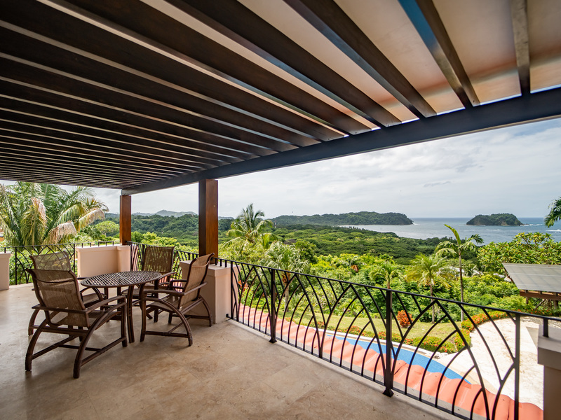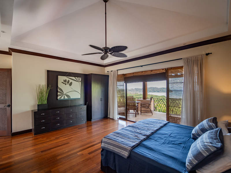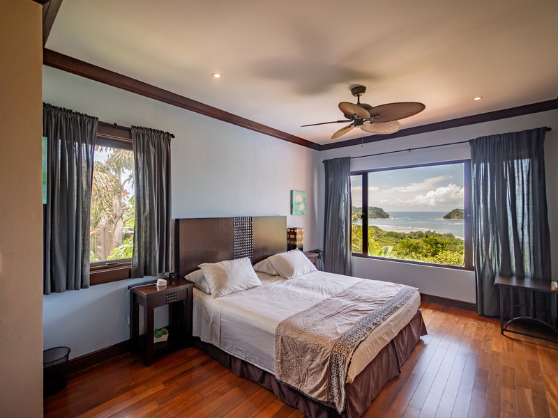 Each bedroom enjoys sweeping views of Sámara Bay and Isla Chora, with two master suites offering large ensuite baths and private balconies. The lower-level bedrooms were thoughtfully designed to accommodate wheelchair access, ensuring comfort and inclusivity for all guests.