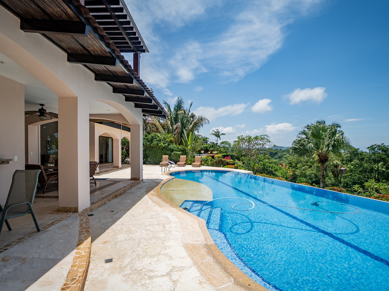 The villa features a fully equipped gourmet kitchen with a temperature and humidity controlled pantry, expansive living and dining areas, and floor-to-ceiling glass doors that open to a 40-foot saltwater infinity pool and outdoor dining spaces. Multiple terraces, a covered BBQ kitchen, and a rooftop sunset deck make it ideal for entertaining, while lush gardens and towering palms attract monkeys, macaws, and hummingbirds to your doorstep.