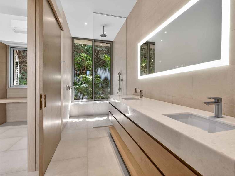 -Primary suite with dual walk-in closets, double vanities, balcony access, and sweeping coastal vistas—even from the bathtub