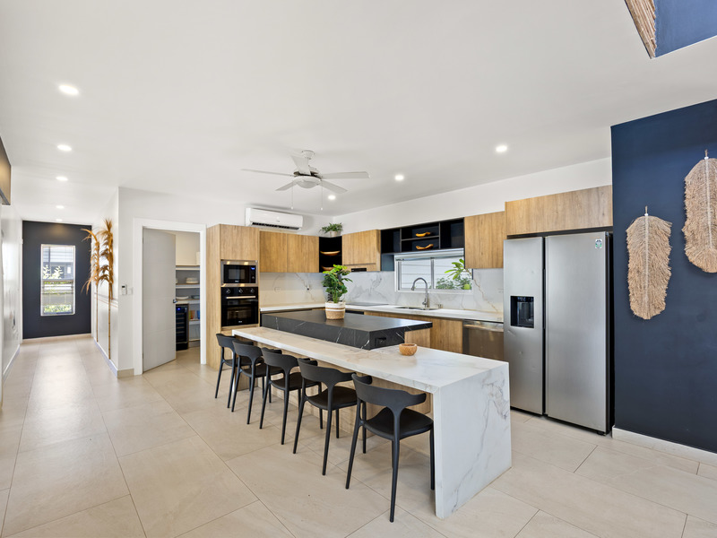 The heart of the home is its bright open-concept living space. The kitchen—fully equipped with modern appliances including a dishwasher—flows effortlessly into the dining and lounge areas, making everyday living and entertaining equally seamless.