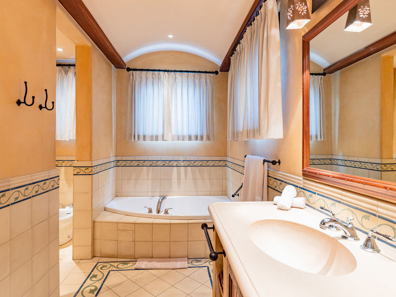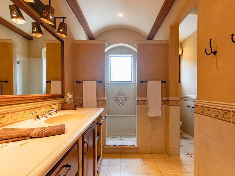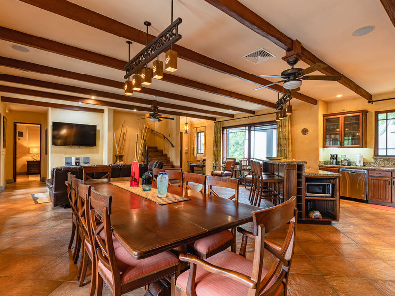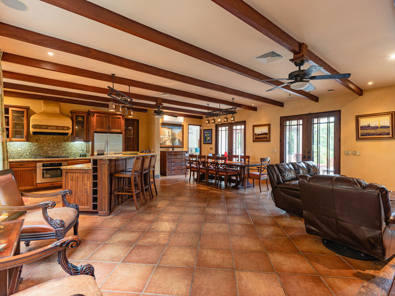 Designed by California architect Miguel Podolsky and built by engineer Karl Gronemeyer, this 6-bedroom, 4.5-bath residence spans nearly 6,000 sq. ft. and blends Spanish Colonial architecture with fine finishes. The open floor plan includes a Great Room, dining area, and professionally equipped kitchen with custom cabinetry and granite countertops. The poolside master suite opens to shaded terraces, while two guest suites share a traditionally styled bathroom.