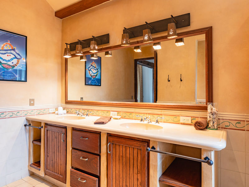 Upstairs, a dramatic entertainment room features a vaulted hardwood ceiling, wine bar, home theater, and lounge. Handcrafted doors lead to a covered balcony with hammocks. The upper master suite includes high ceilings, a private terrace, a spacious bath with dual showers, and a walk-in closet. Two additional guest suites share a bathroom, completing this thoughtfully designed and beautifully executed home.