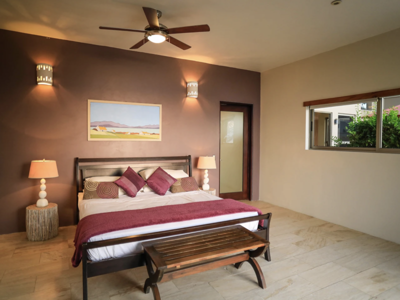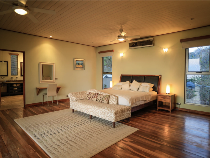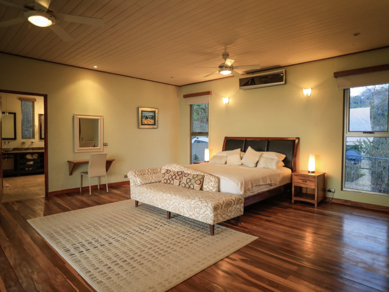 The open floor plan of the living area includes a bar, dining area and a large lounge area with satellite TV. The house has AC, but was designed to ventilate with the sea breeze that flows through the valley behind the house, boasting the best of both worlds. Beautiful natural coral tile floors run through the property and continue outside. The five ocean view ensuite bedrooms all come with AC, ceiling fan, writing desk, and private balcony. The master bedroom is a large breezy room with king size bed, beautiful wooden floors, chaise longue, TV, AC, WiFi. The gigantic master bathroom has two walk in showers, his and her sinks, a two person Jacuzzi and a walk-in closet. Outside in the patio and garden there is a 6 person breakfast table, BBQ, infinity pool, pool loungers, 6 person Jacuzzi and an enclosed garden with a kids swing. There is also a carpark which holds up to four cars and a private gated entrance.