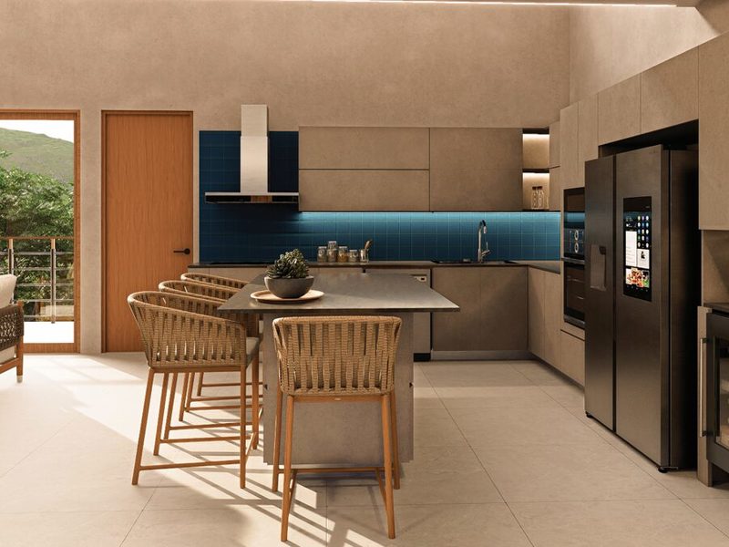 The heart of the home is a chef-inspired kitchen, complete with custom wood cabinetry, premium appliances, and a large island ideal for casual dining. The open-concept design flows seamlessly into the living and dining areas, extending to expansive terraces that invite you to entertain or unwind while surrounded by tropical beauty.