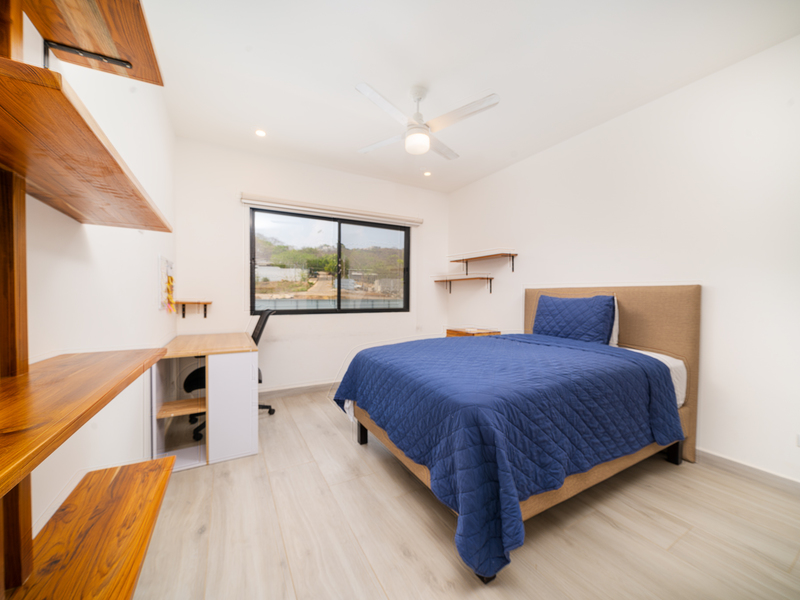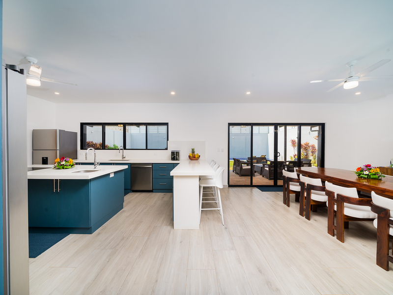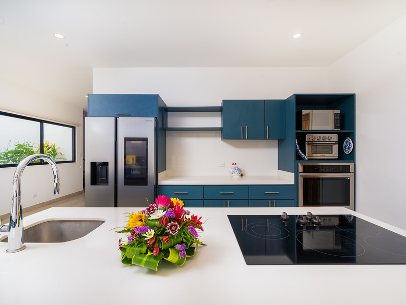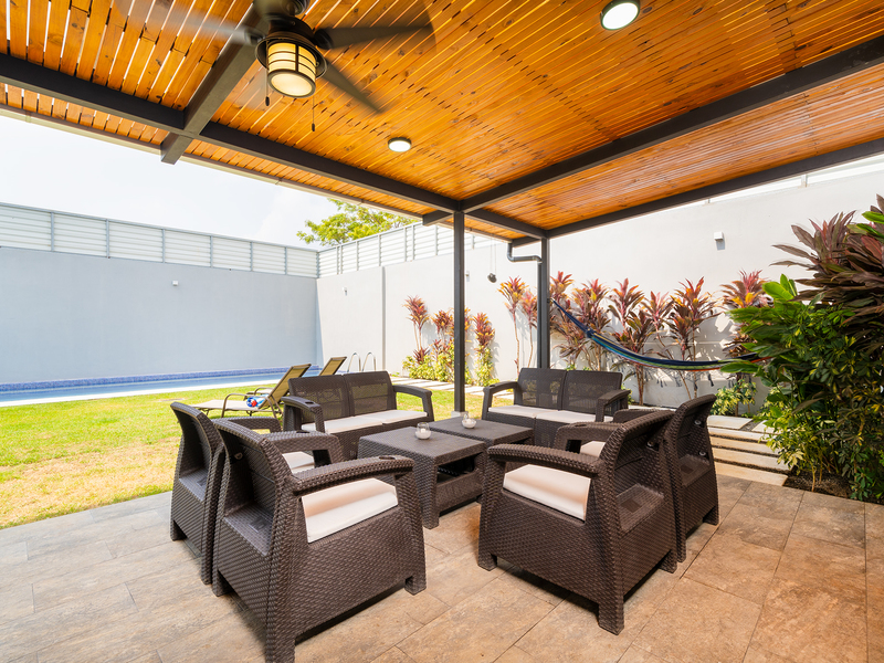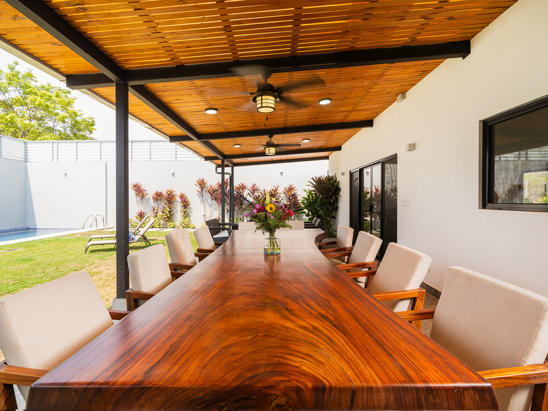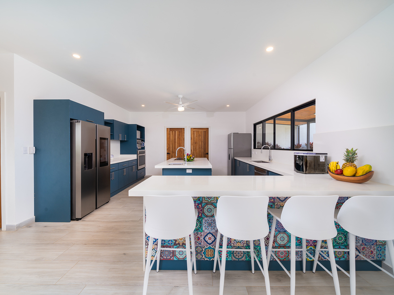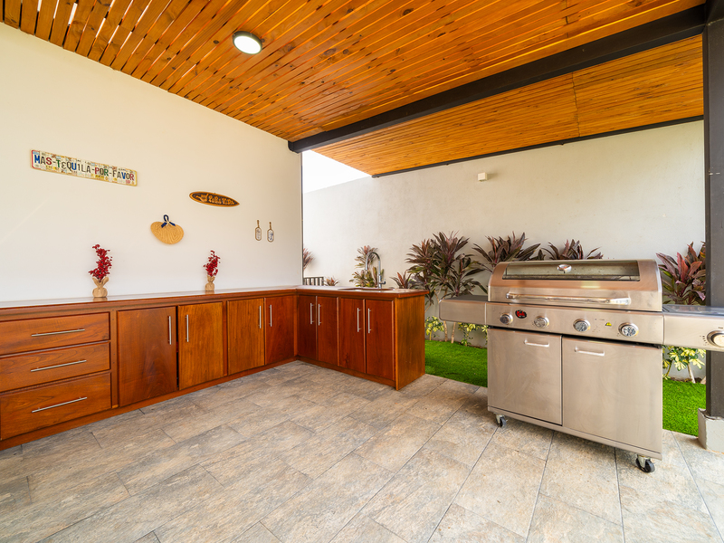 For entertaining, the gourmet kitchen shines, equipped with an island boasting two sinks, two refrigerators, and a breakfast bar. A convenient pantry and laundry room enhance daily living. Step outside to a shaded oasis featuring a hammock, outdoor seating, and custom dining tables crafted from local Guanacaste wood, accompanied by a BBQ grill.