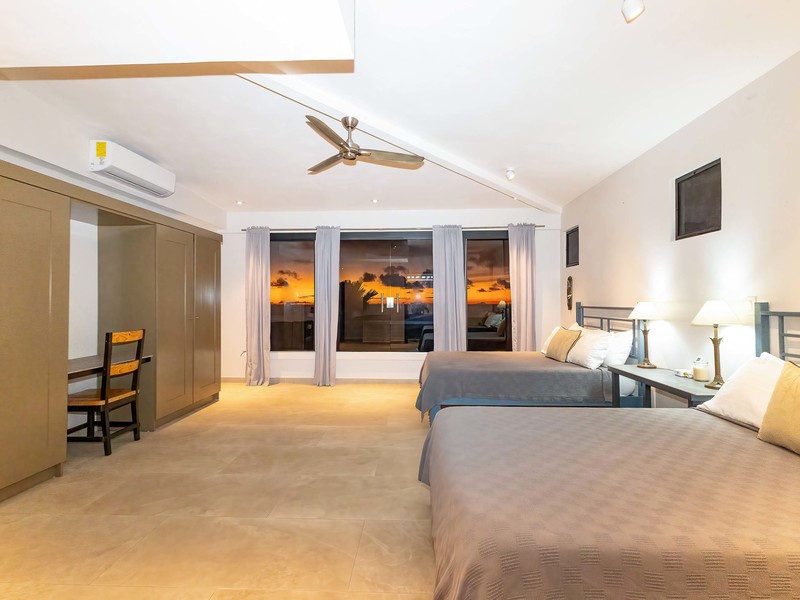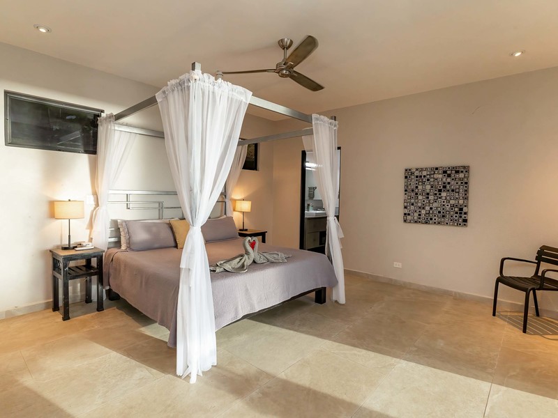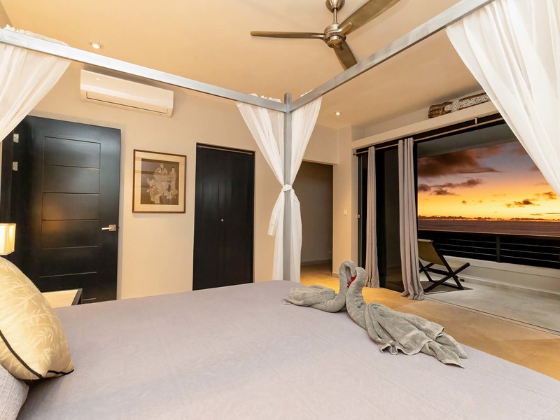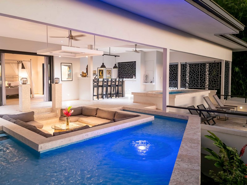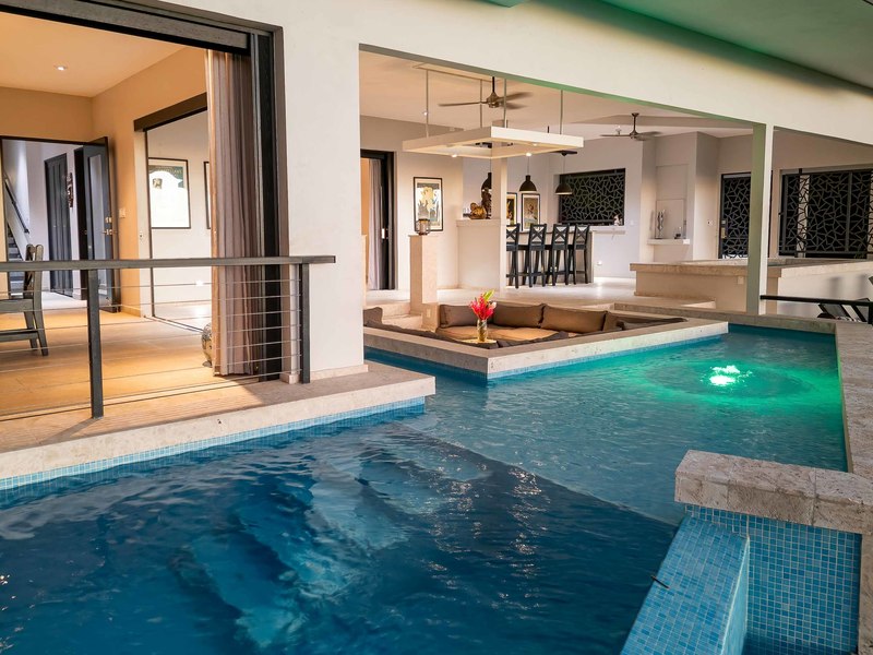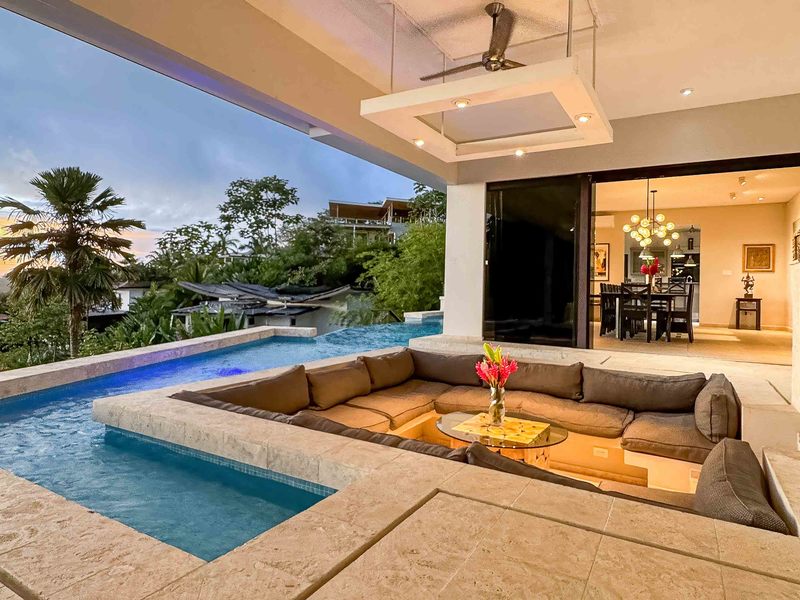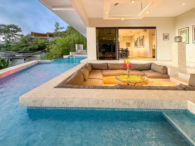 Inside, the villa is designed for both indulgence and effortless flow. Several of the home’s bedrooms feature sweeping ocean panoramas and oversized, spa-inspired bathrooms. At the heart of the home sits a dramatic sunken living room wrapped entirely by the pool—an architectural showpiece that allows every guest a front-row seat to unforgettable sunsets. The expansive wraparound terrace, complete with a large built-in jacuzzi, creates a seamless connection between indoor elegance and open-air tropical living.