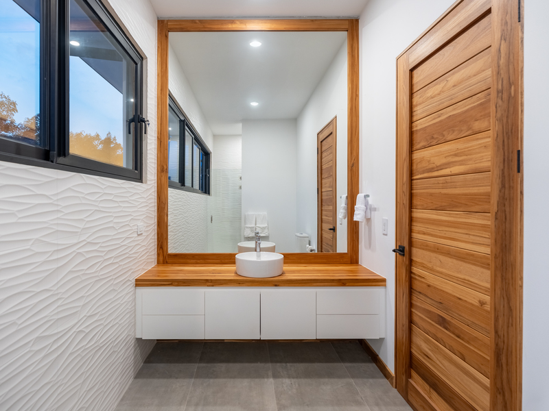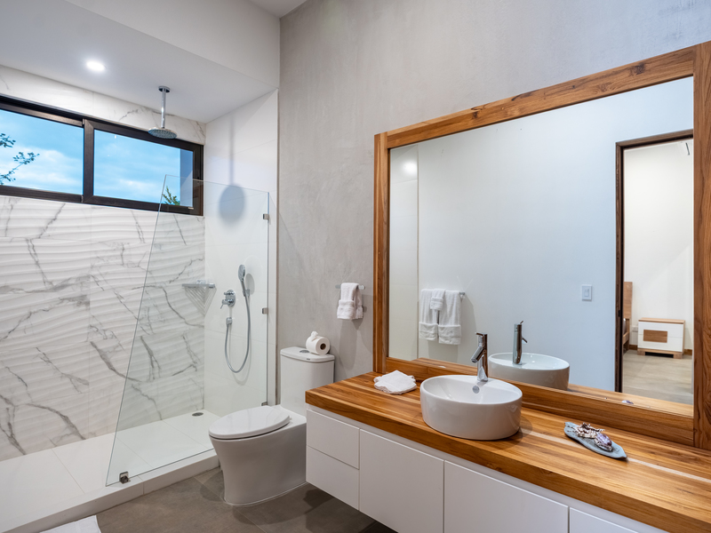 The Guest House offers a charming, open-concept living and dining space with a fully equipped modern kitchen. It includes three bedrooms, each with its own ensuite bathroom, ensuring guests enjoy their stay in complete privacy. A private garage with direct access enhances both security and convenience, while elegant wood accents carry through the same refined aesthetic.