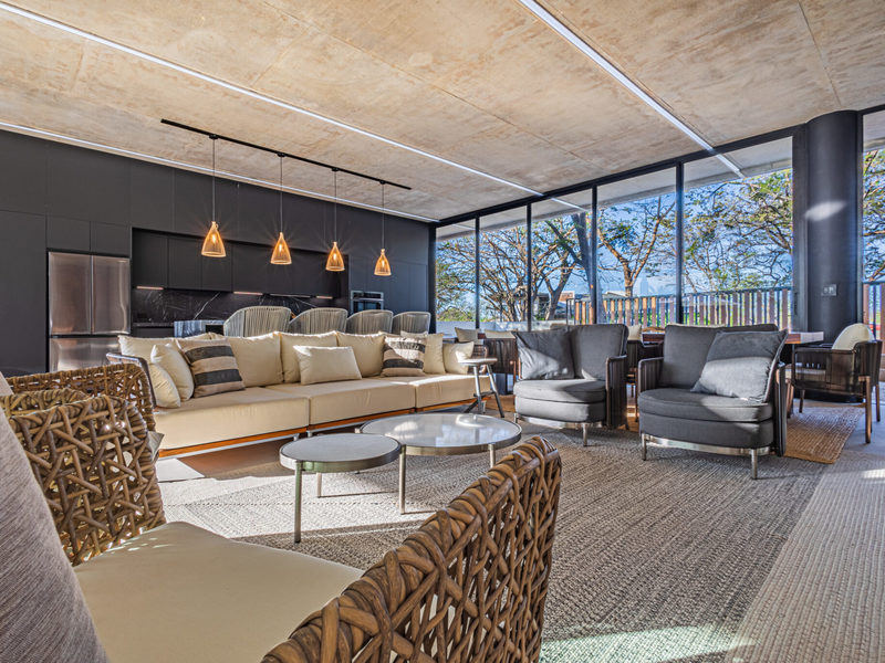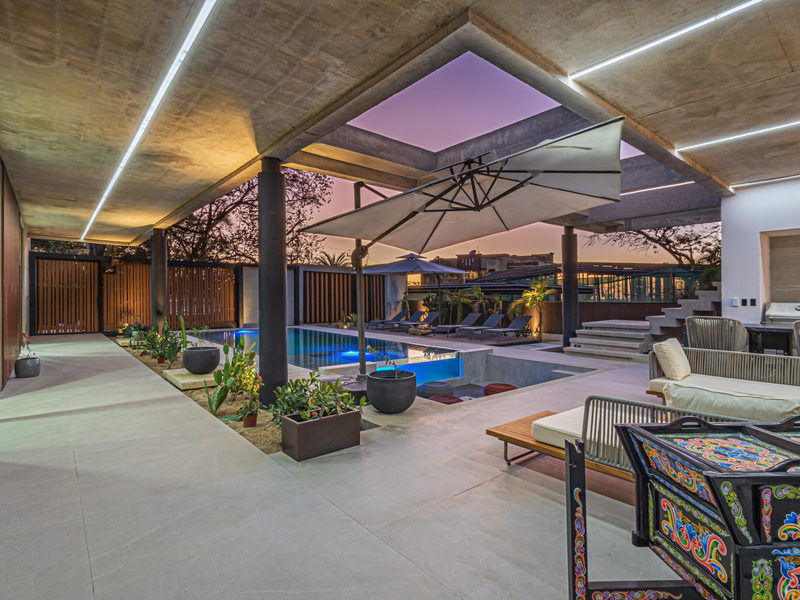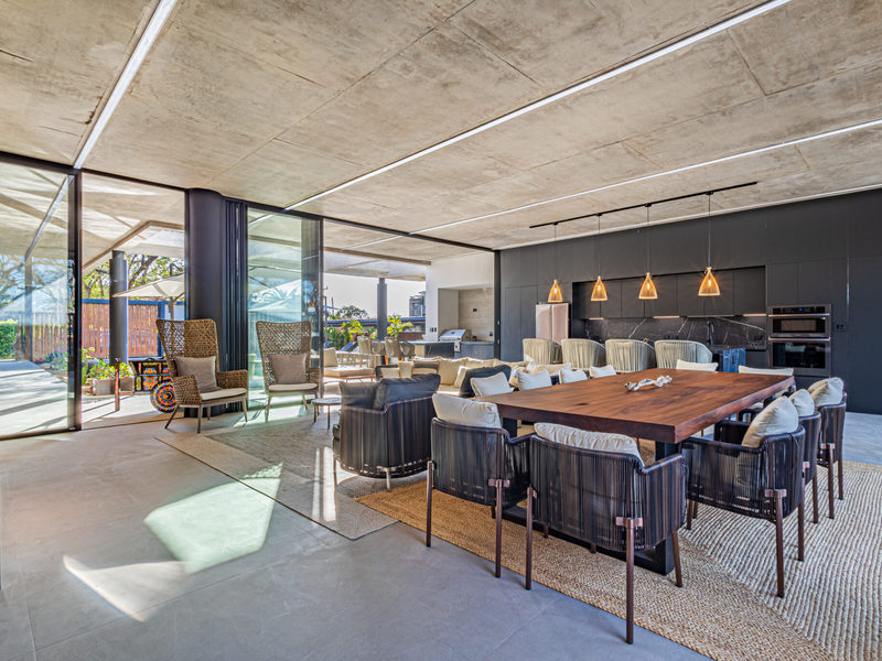 High-end finishes include polished concrete floors, black marble countertops in the kitchen and bathrooms, and warm teak wood accents that balance contemporary elegance with natural textures. Additional features include electric blinds, Italian furniture imported from EuroMobilia, concrete slab walls, and durable WPC wood composite elements.