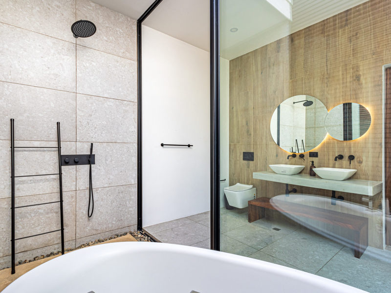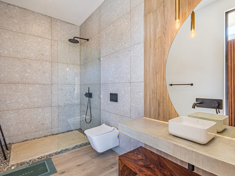 The pool is finished with Indonesian Sukabumi green stone, creating beautiful emerald reflections and a tranquil, refreshing ambiance. All materials have been carefully selected for exceptional quality, durability, and low maintenance.