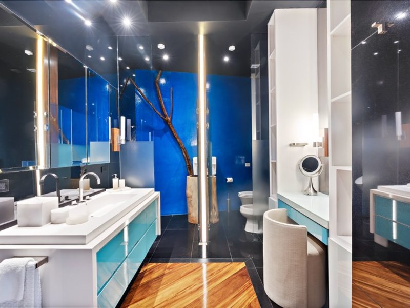 64” ultra-thin hydraulic TV hidden in a custom lacquered cabinet
