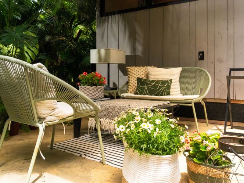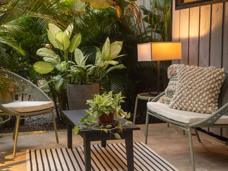 -Privacy & Ambiance: Meticulously landscaped tropical vegetation ensures seclusion for each bungalow’s private patio, complete with seating for 3–4, a coffee table for breakfast, and a side table with a lamp.