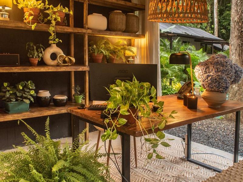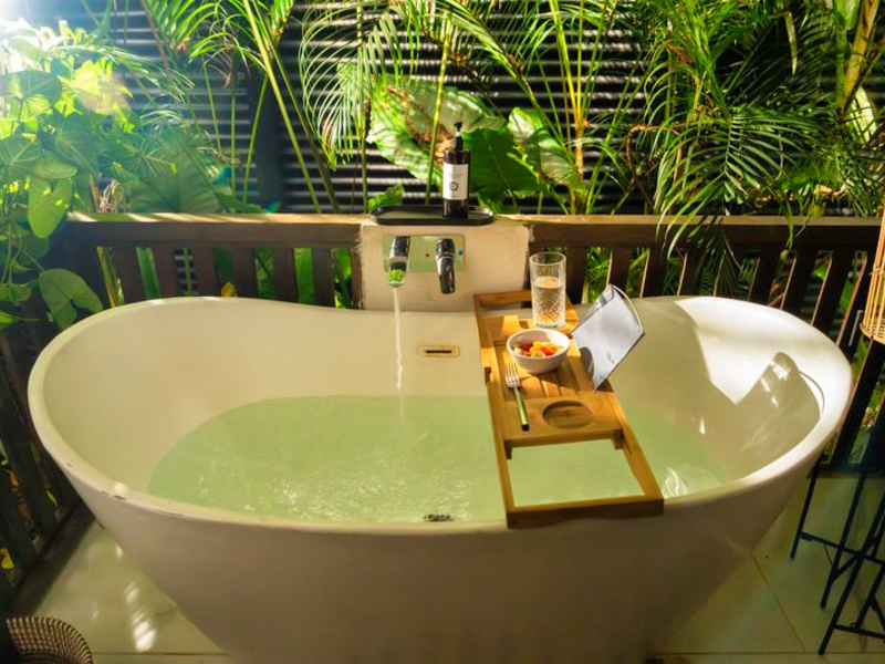 -7 Exclusive Bungalows: Designed for two guests each, featuring Scandinavian/boho-inspired interiors with queen-size beds, full kitchenettes (microwave, induction range top, mini fridge, espresso machine), 40-inch Android TVs with streaming services, Bluetooth speakers, 100 Mbps Wi-Fi, spacious rain showers, safes, beach towels, and private terraces overlooking a central pool or lush tropical gardens.
